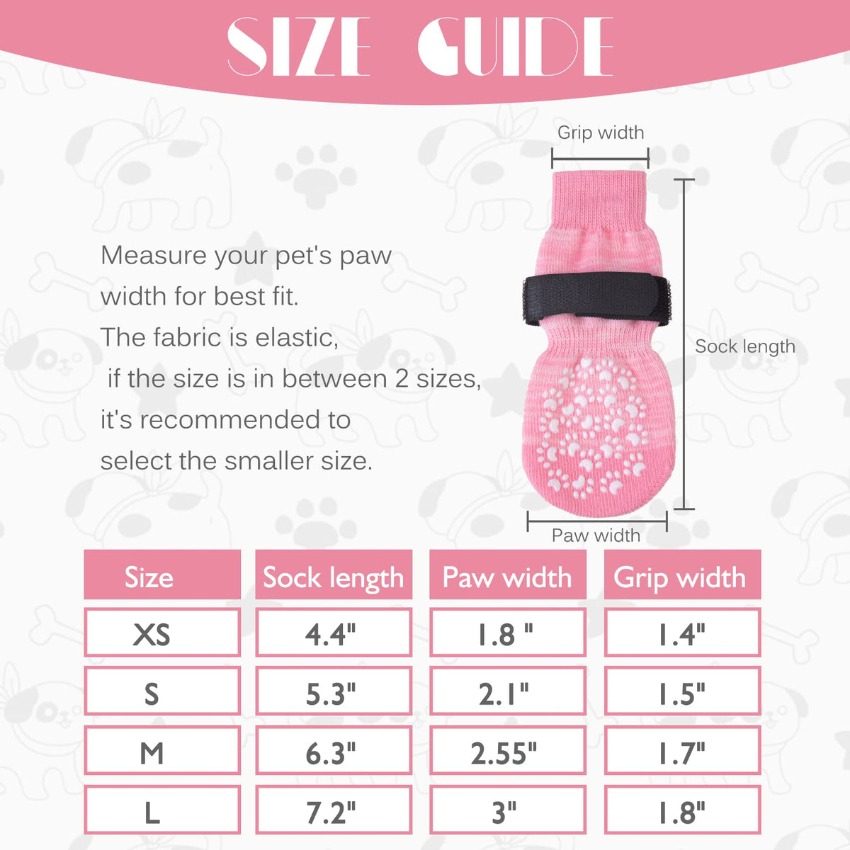 Size XLarge:Paw width35 Length 787 grip Width 19 Muti sizes available fit for many pets Please measure your pet before purchase if your size is between the two sizes its better to choose the smaller size Because our pet paw protector socks are fabrics with elasticity Double Side No-Skid: Its our patent exclusive design Double side and big area coverage adhesive provide strong extra traction really help your senior dogs walk around in the house again So if your fur friend has problems who was splaying and keeps slipping on your wooden floors with back legs we suggest you would buy these the soles and wearing our socks prevents dogs from licking and irritating the wound further aid in healing foot wounds Durable Material: Made of elastic and comfortable material Its soft and Light your dogs will easier to accept it The breathable knit fabric durable bottom keep dogs paws warmer in cold winterBut we do not suggest taking a long time outdoor walking Anti-Fall Off:Extra adjustable and detachable belt makes the socks keep stay on your lively and naught pets paw never fall off easily You can use elastic black loop fastener to adjust the tightness of your dogs sock but dont fix it too tightly makes your dogs feel good and will not drop when walking or running What You See is What We Provide: 4pcs socks and 4pcs detachable belts in 1 package if you have use boots shoes or paw pads and they dont satisfy you youll regret not seeing our socks sooner after using We updating the size recently if after ordering you find that the size does not fit your pet please contact us and we will help you with sizing issues or any other issues you may have)