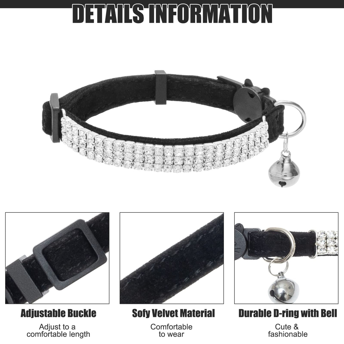 Adjustable Size: The cat collars are adjustable length from 9 inches to 12 inches and 38 inch width that are suitable for any stages of your furry friend from a little kitten to a senior cat Superior Material: Our cat collars are well made of top grade velvet material super soft and lightweight which are quite comfortable for wearing and wont irritate the skin of your pet Breakaway Buckle: The cat collars with breakaway buckle design can be released easily to ensure the safety of your beloved kitty when heshe is climbing trees or investigating small places Sparkly Diamante: We adopt special excellent workmanship to equip the shiny rhinestone decoration for these cat collars that will make your furry baby more adorable and eye-catching It is the best choice for your holiday gifts Perfect Present: The set including 2 pcs cat collars are fashionable and personalized designed that is enough for alternative replacement and also suitable for the owner who has 2 kittens