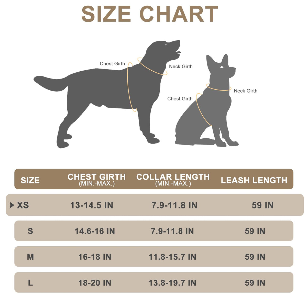 EXPAWLORER Puppy Harness Leash Collar Set Specifications Packet: 1x dog vest harness + 1x dog leash + 1x dog collar. SIZE XS: Chest Girth is 13'' to 14.5''. Collar Length is 7.9'' to 11.8'', Collar Width is 0.6''. Leash Length is 59''. S: Chest Girth is 14.6'' to 16''. Collar Length is 7.9'' to 11.8'', Collar Width is 0.6''. Leash Length is 59''. M: Chest Girth is 16'' to 18''. Collar Length is 11.8'' to 15.7'', Collar Width is 0.8''. Leash Length is 59''. L: Chest Girth is 18'' to 20''. Collar Length is 13.8'' to 19.7'', Collar Width is 0.8''. Leash Length is 59''. Please see our measurements carefully to get a satisfying harness collar and leash set for your cherished pets. EXPAWLORER Puppy Harness Leash Collar Set Details Safety Buckle: In case of danger, the breakaway buckle can prevent suffocation or neck strain. D-ring Design: The 2 D-rings prevent the pet from being lost for outdoor walking and playing. Hook and Loop Fastener: It is not easy to deform with strong tensile strength and you can make sure the tight fits snugly. EXPAWLORER Puppy Harness Leash Collar Set Benefits Firm Stitching Workmanship: Heavy duty and sturdy. Breathable Mesh Fabric: Skin-friendly and fast cooling. Soft Edging Design: It is designed to fit the body's curvature with no limited movement.
