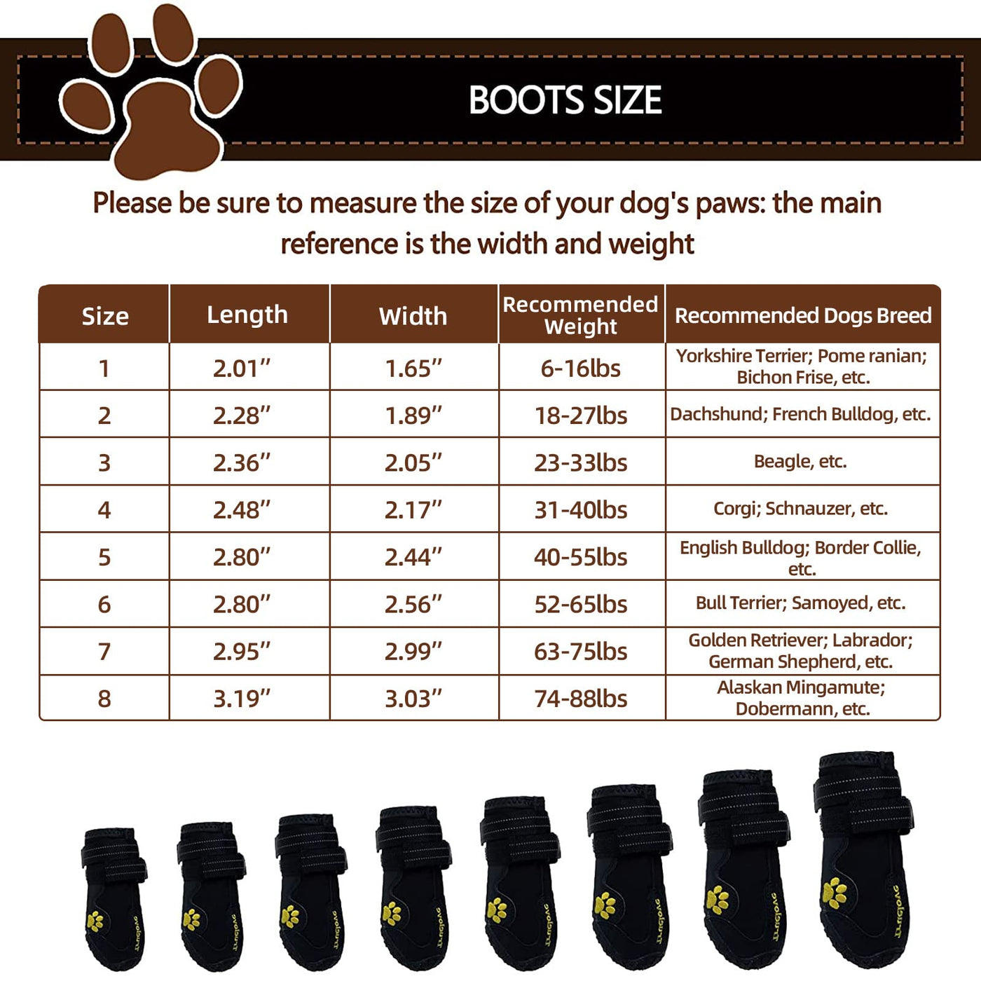 Notice: 1, Place the paw on a piece of paper and press down on the top, mimicking how the paw spreads when the dog is walking. 2, Mark the left and right sides on the paper and measure the distance between the marks. 3, Choose size according to width is better, the width of the paw should be smaller than the boot size chart. 4, The size is the inside size of the boots, not boots size outside, In between size, please choose the larger size.