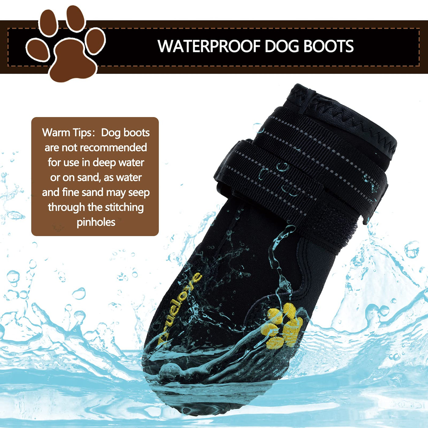 Q: What materials are used in these dog boots?A: These dog boots are made from high-quality neoprene, which is not only flexible and skid-resistant but also waterproof, ensuring your dog's paws stay dry and protected in various weather conditions.