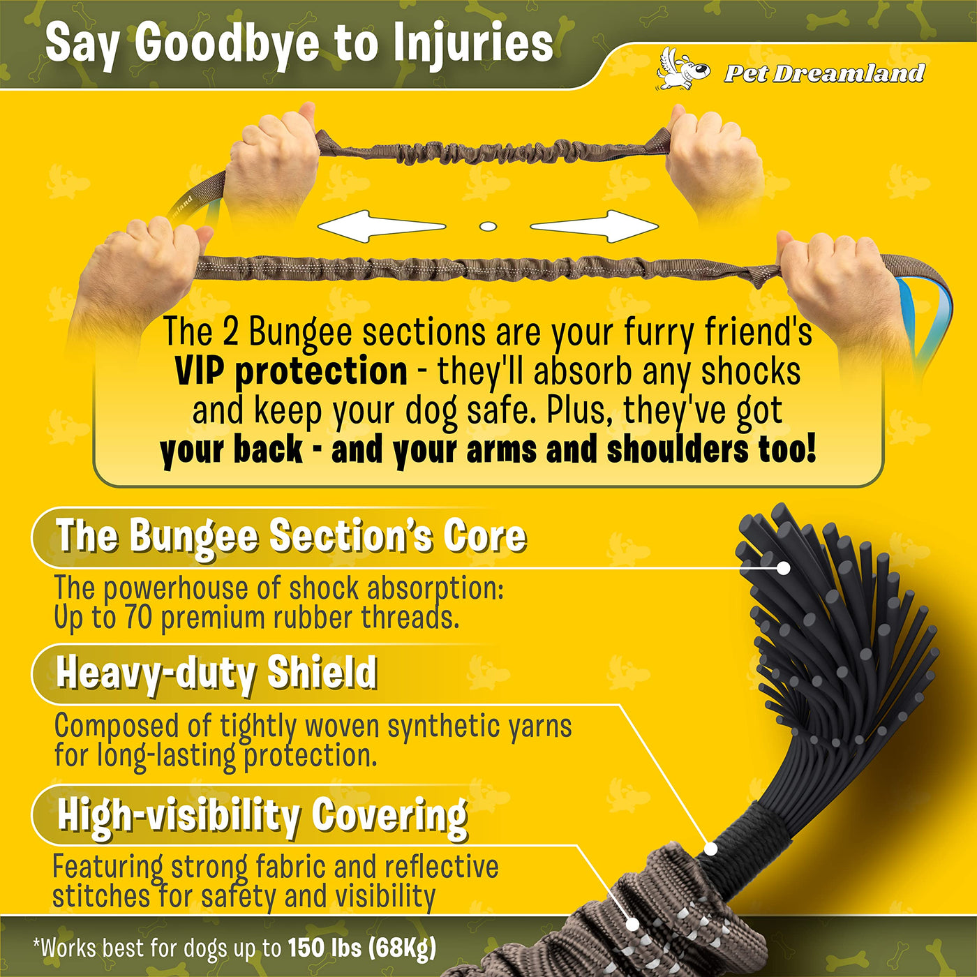 Q: How does the bungee feature of the leash work?A: The bungee feature of the leash absorbs shocks, providing a smoother experience while walking or running with your dog. It helps prevent sudden jerks that could strain both you and your pet, promoting better control and comfort.