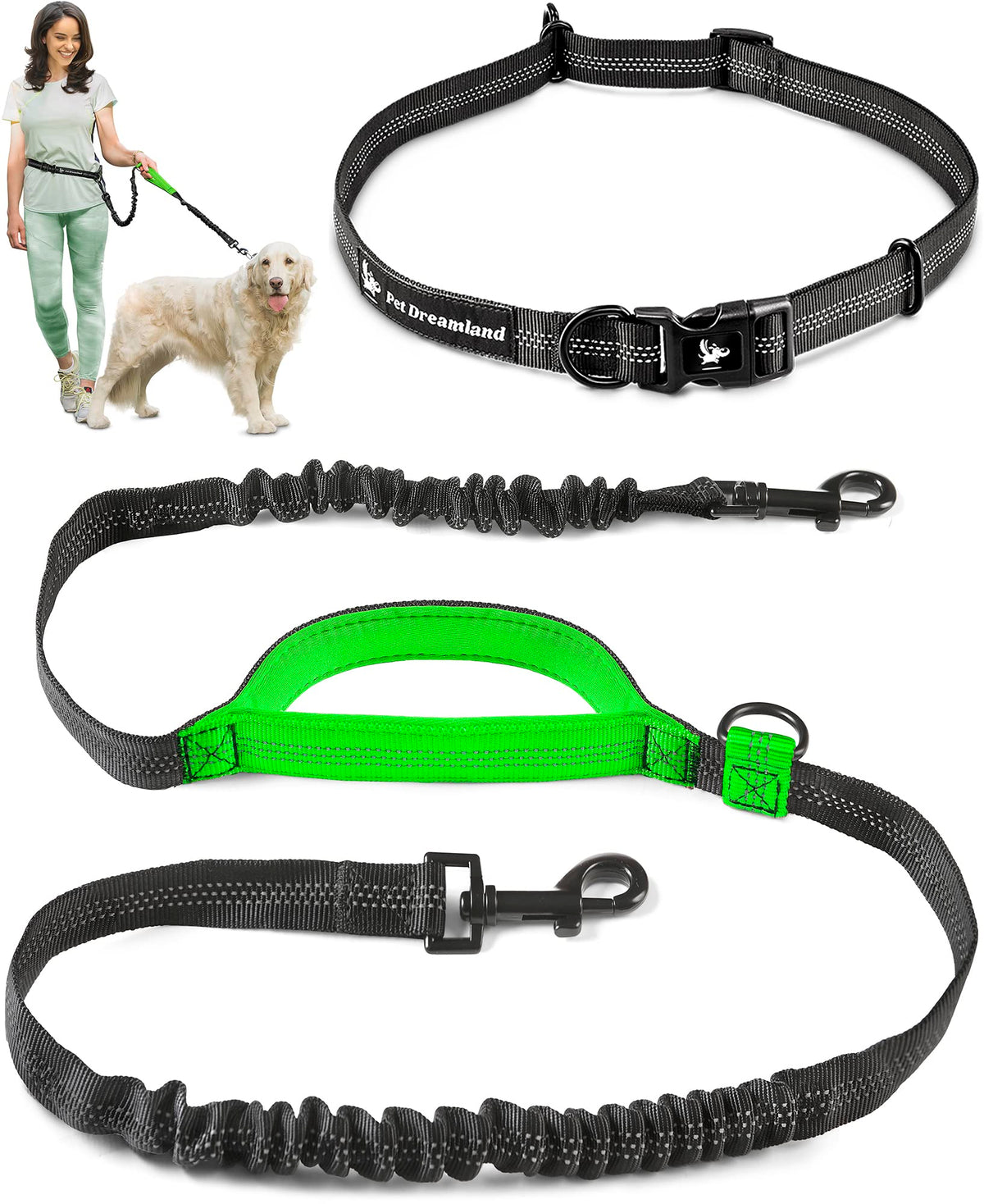 Product Specifications: Product Name: Hands Free Dog Leash With One Padded Handle (Short Version) Size: One Large Dog (35-150 Lbs) Bungee Leash: Length: 43&Rdquo; - 55&Rdquo; | Weight: 6.9 Oz Waist Belt: Length: 27&Rdquo; - 48&Rdquo; | Width: 1&Rdquo; | Weight: 4 Oz Color: Black &Amp; Green&Nbsp;(Also Available In Black &Amp; Red; Black &Amp; Green; Dark Grey &Amp; Pink; Khaki &Amp; Orange)