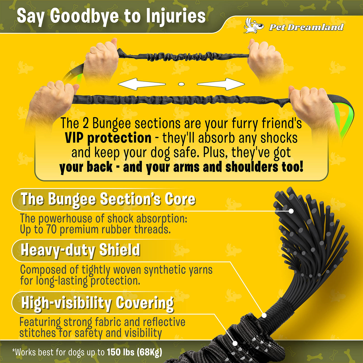Q: What is the weight capacity of the Hands Free Dog Leash?A: The Hands Free Dog Leash is designed for large dogs weighing between 35 to 150 lbs, making it suitable for a wide range of breeds.
