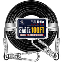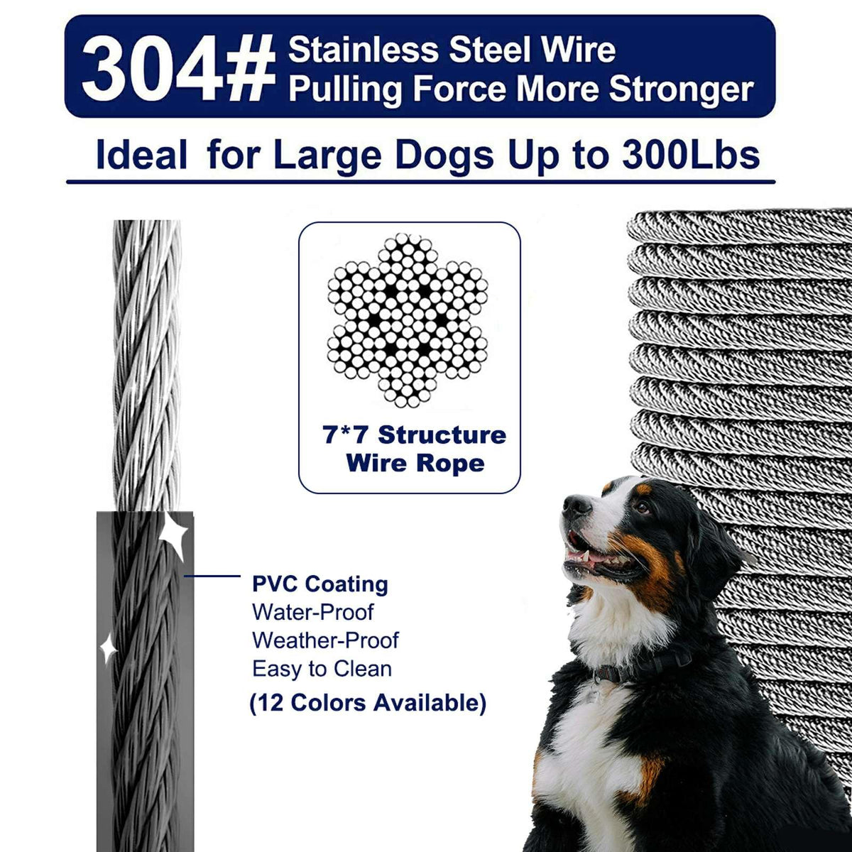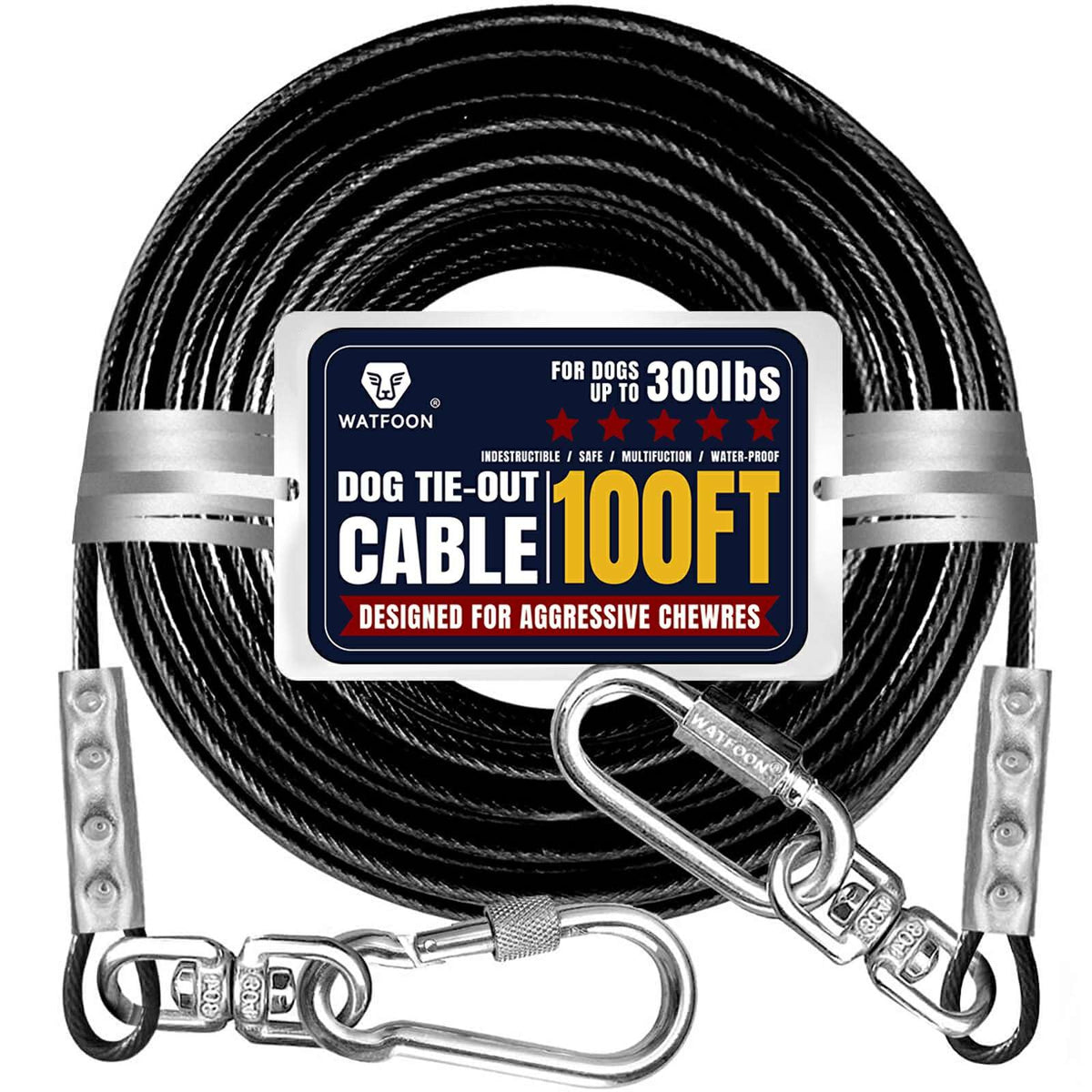 Durable Cable Material, Rustproof, Heavy Duty And Durable. Hooks Are Used At Both Ends,It Is Very Simple To Use. 100Ft Length That Let Your Dog Move Around Freely. Great For Family Pets That Spend Time In Camping,Park,Yard, Beach Or Other Outdoor Activities. Material:Steel + Vinyl Coating Length: 100Ft Max Suitable Dog Weight: 480 Pounds Package Included: 1 X 100Ft Dog Tie-Out Cable