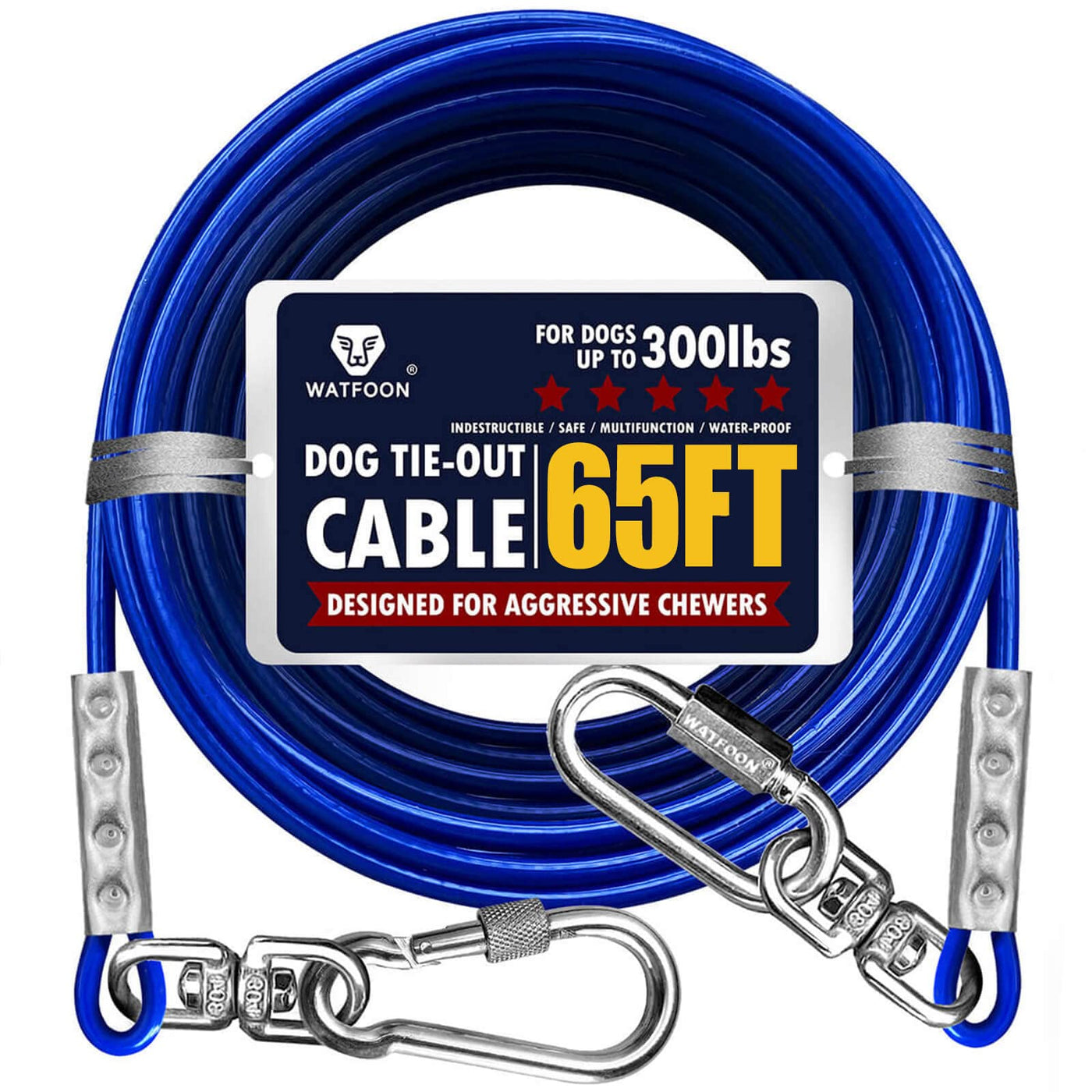Extra Strong Stainless Steel Cable --- 65 feet size long made of stainless steel wire 5mm in diameter with PVC coating high tensile strength impact toughness corrosion resistance Double crimp for stronger ends our heavy duty dog cable has break strength of 1000 pounds. WATFOON chew proof tie-out cable provide more space for free movement while ensuring your pets safety