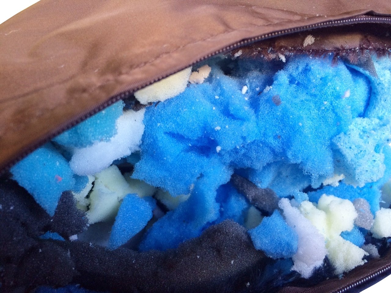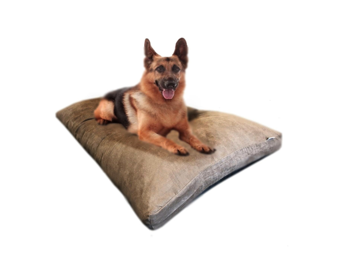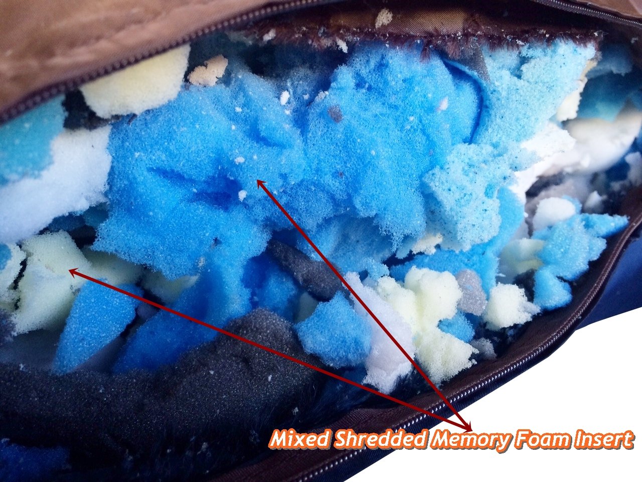 Extra Stuffed Pillow Bed; Materials: Bed Size: 55''x37'' with a unique mixture blends of Shredded Memory Foam Micro Foam and Soft Poly Fiber. External Cover Material and Color: Standard Brown 120gsm Microsuede Fabric with Anti Slip resistant black dots base. Internal Cover Liner: Taffeta Brown Full Waterproof Cover.