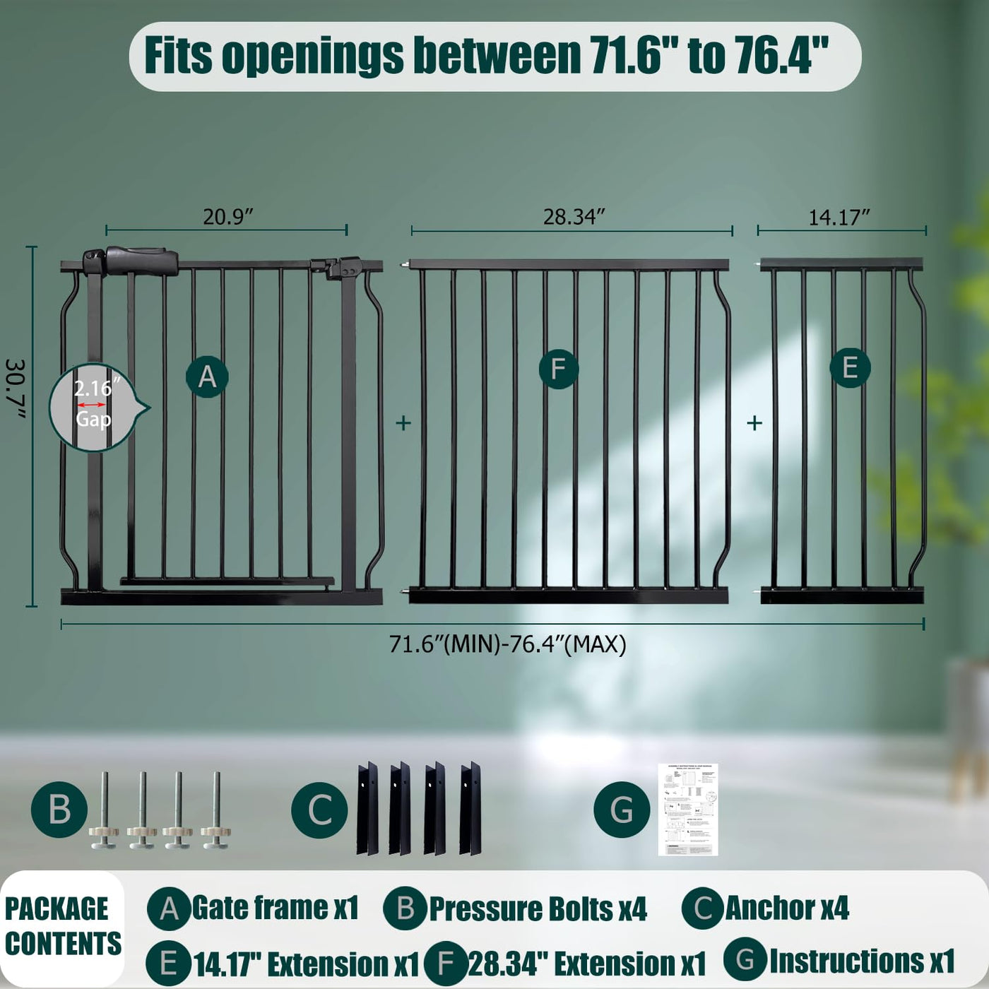 Extra Wide Baby Gates - 71.6-76.4 Inch, Black Metal Pressure Mounted Child & Pet Gates for Stairs & Doorways