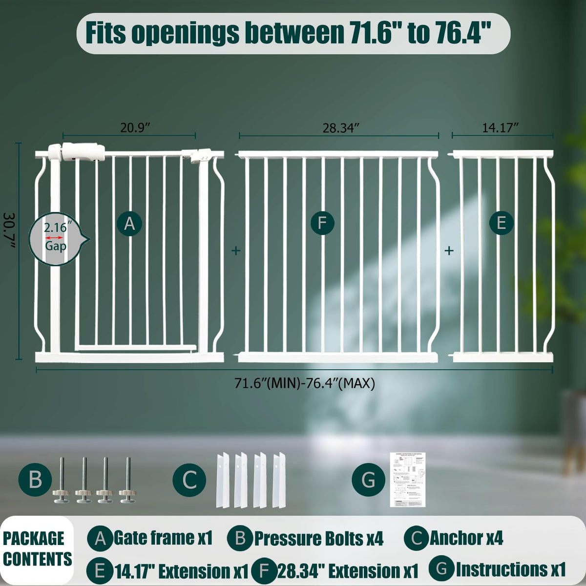 Extra Wide Baby Gates - 71.6-76.4 Inch, Heavy Duty Baby & Pet Safety Gate, White Metal, Tension Mounted Child & Pet Gates for St