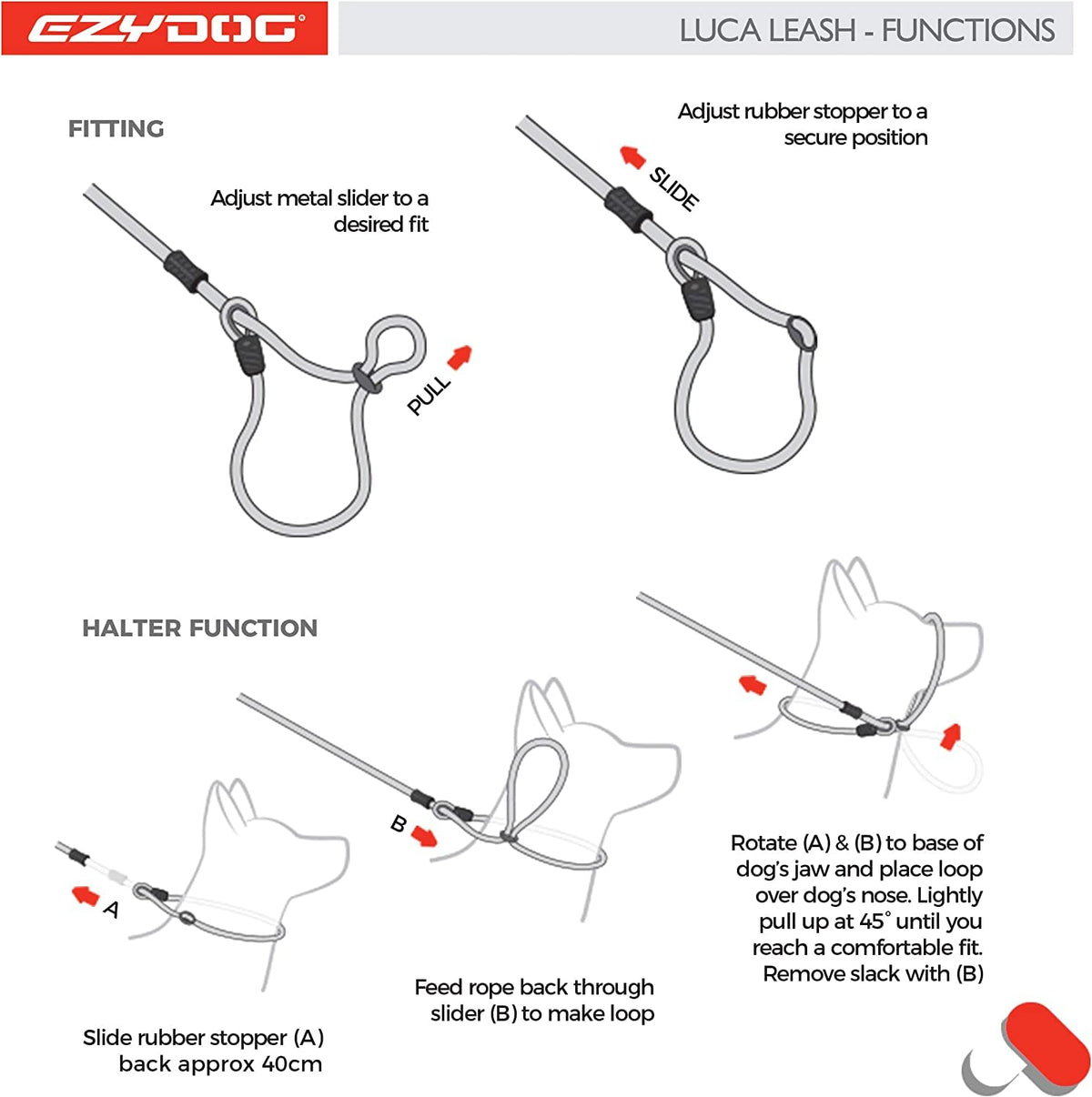 Q: What is the EzyDog Luca All-in-One Slip Collar Climbing Rope Dog Leash Combo designed for?A: The EzyDog Luca leash is designed for providing control, training, correction, and exercising for both large and small dogs. Its unique slip collar system allows for quick and gentle corrections, making it ideal for teaching your dog to walk comfortably beside you.