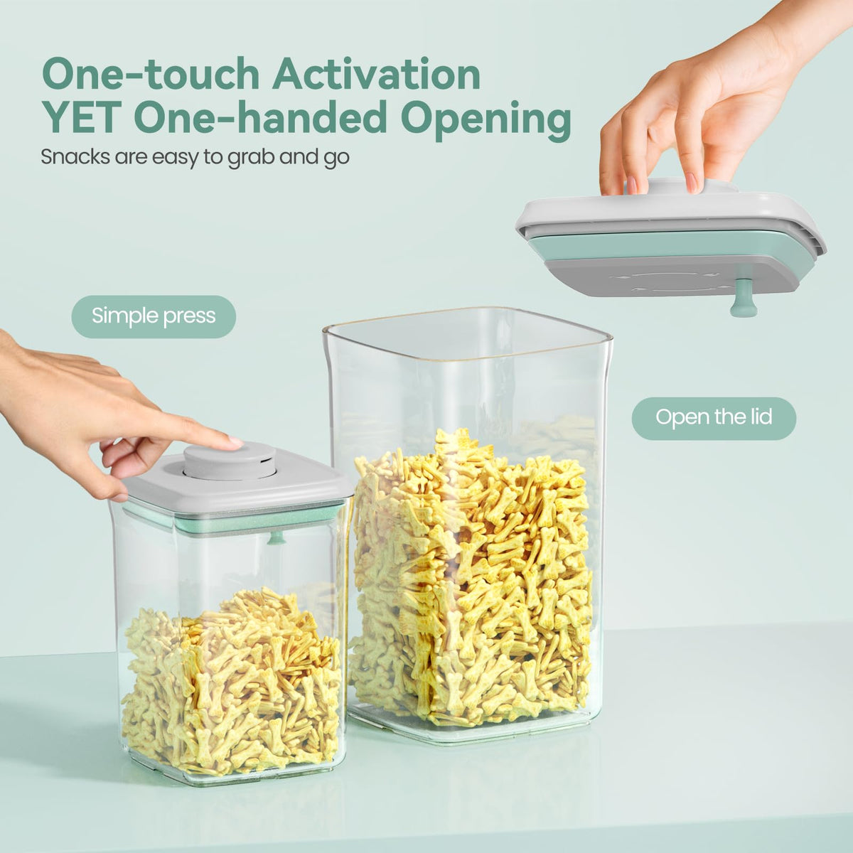 Catchy Slogan: Discover the ultimate in freshness and convenience with our Pet Treat Storage Container-keeping tails wagging with every treat! Key Features and Benefits: Patented Airtight Lid: Ensures an airtight seal, preserving treat freshness by keeping moisture and air out. Durable Construction: Made from sturdy, lightweight plastic, safer and more durable than glass or ceramic options. Transparent Design: Allows easy viewing of treat levels, eliminating guesswork and ensuring you never run out unexpectedly. Stackable and Space-Saving: Maximizes pantry space while keeping your pets treats organized and easily accessible. One-Handed Operation: Effortlessly open and close with a simple press, perfect for quick treat rewards during training. Easy to Clean: Designed for hassle-free cleaning; simply rinse with water and detachable lid for thorough washing. Product Specifications: Materials: AS plastic, BPA-free, meets baby-grade safety standards. Capacity: 2.2Qt/2L and 1.3Qt/1.2L Style: Modern, clear body with a sleek, ergonomic design. Customer Service Commitment: 24/7 Online Support: Our dedicated customer service team is available around the clock to assist you with any inquiries or concerns. Contact Us: Have a question? Contact us anytime for prompt assistance. Upgrade your pets treat storage today with our innovative container. Perfect for pet owners seeking durability, convenience, and peace of mind. Dont wait-order now and transform how you store and enjoy your pets treats!