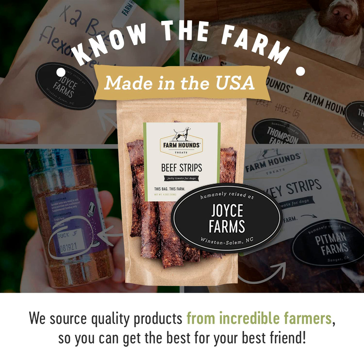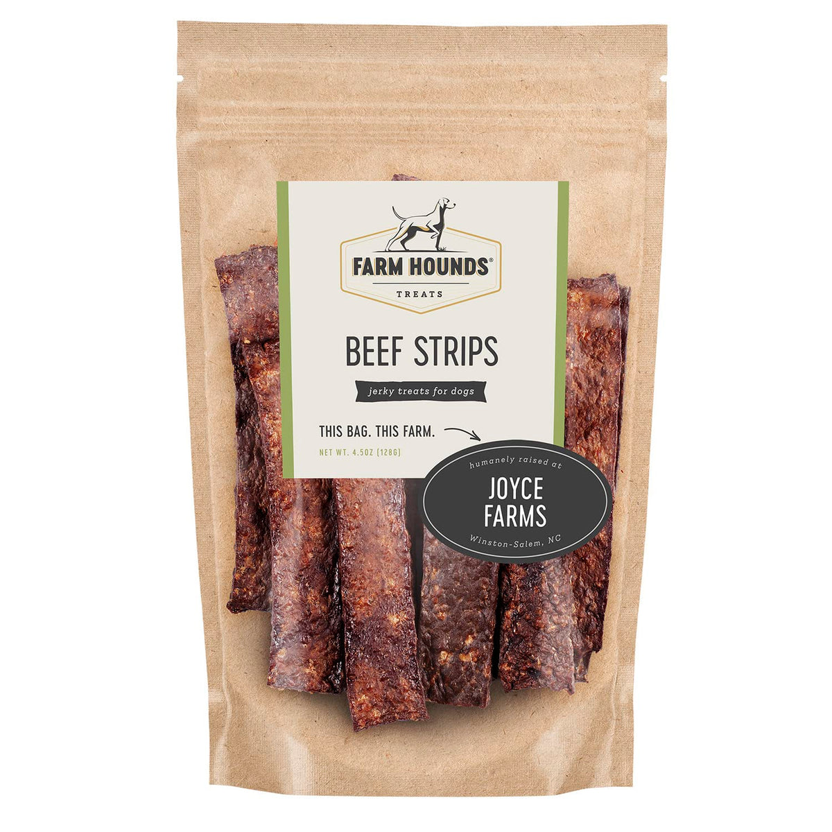 Our Beef Strips are humanely-raised break-to-size beef jerky treats for dogs that all breeds, all sizes and all ages can consume. Use them as dog training treats, rewards, or simply as snacks for your furry best friends. These beef strips are available in a convenient 4.5 ounce pack. Our Beef Strips jerky treats are full of vitamins and minerals. Selenium helps strengthen the immune system, leading to healthy skin and a shiny coat. Phosphorus helps support healthy kidney function. And healthy levels of protein to help build and repair your dogs muscles and body tissue. Transparently sourced from 100% pasture-raised, grass-fed cattle, these dog chews are a perfect blend of beef muscle meat, organ, fat, bone and blood, all essential for a well-rounded carnivore diet. With the power of dehydration, we offer your pups treats that are free of salt, sugar, fillers and chemicals. Everything we make is connected to family farms. Locally sourced in the USA, each label shows you what farm we worked with to make that exact bag. We believe if you can trust the farm, you can trust the product. At Farm Hounds, we believe healthier animals are happier animals. With your canine in mind, we make all of our treats nutritionally beneficial and delicious. Our close relationship with all-American family farmers who raise their animals in a humane way, helps us use premium raw materials for our products.