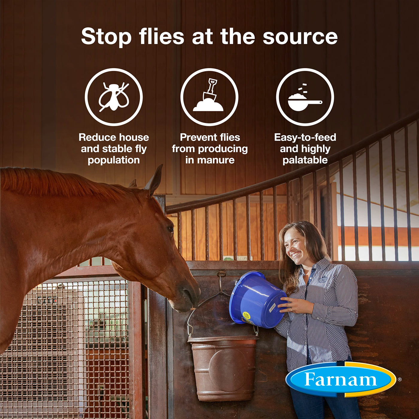 When flies are a menace in your stable, its time to target them at their source - your horses manure. If not treated, the manure from one horse has the potential to produce tens of thousands of flies in a single day. Introduce SimpliFly Feed-Thru Fly Control to your horses daily diet, and suddenly youre turning the favorite breeding grounds of stable and house flies into a No Fly Zone. When fed daily, SimpliFly Feed-Thru Fly Control breaks the fly lifecycle by preventing fly larvae from developing in a horses manure. This fly growth regulator is made without organophosphates and will pass through your horses body unabsorbed. The feed will instead excrete the active ingredient diflubenzuron into their manure, preventing it from being a viable breeding ground. This product can be effectively started anytime during fly season, but for best results, beginning daily feeding in early spring before fly season is optimal. SimpliFly Feed-Thru Fly Control is a highly palatable mixture that your horse will readily eat and easily mixes in with their daily feed. As part of an integrated, pest management program, you can see a significant decline in this seasons fly population. Keep your stable happy and target the fly problem at its source with SimpliFly Feed-Thru Fly Control. Bugs dont fly with Farnam, your partner in horse care.