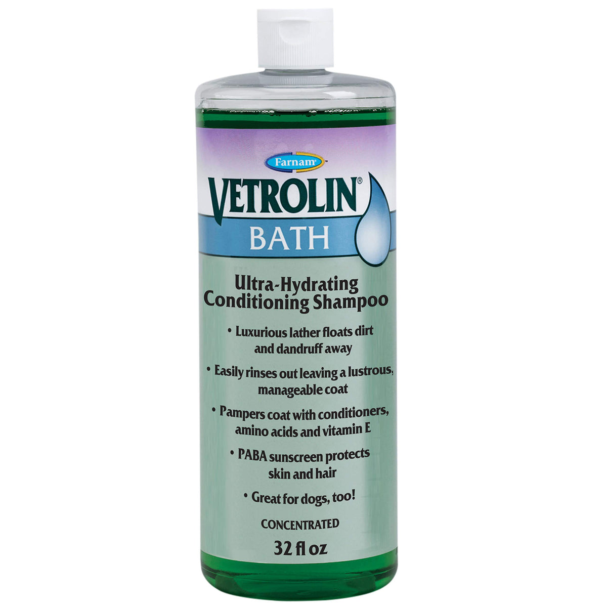 32 oz., Vetrolin bath, protein enriched, conditioning, equine, shampoo. This formula washes away dirt and dandruff. Shampoo produces a rich, thick lather when bathing. Formula protects skin and coat with conditioners, vitamin E and paba sunscreen. Rinses out quickly and easily making product very manageable. Leaves coat looking shiny and healthy.