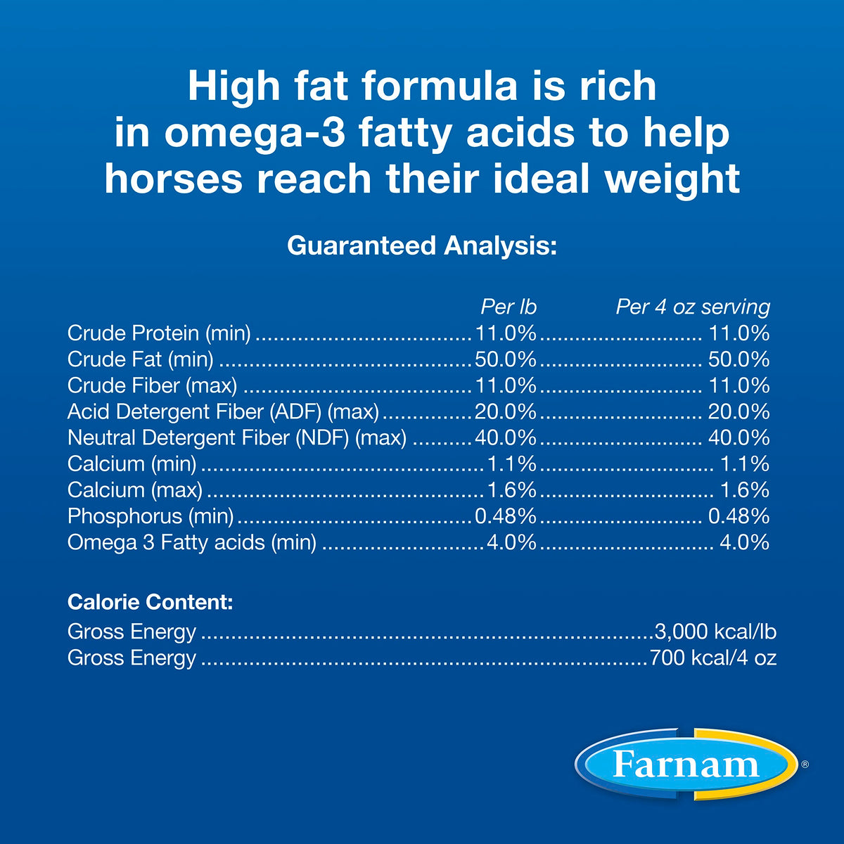 Horses must consume enough calories to meet their daily energy requirements. For horses that need additional calories, it can be challenging to maintain a healthy weight. Fat contains 2.25 times more energy than carbohydrates and is a good way to safely increase calories without a drastic change in feed volume. Weight Builder Equine Weight Supplement is nutritionally formulated with 50% fat for a concentrated source of calories to help maintain optimal weight and body condition. The high-fat formula adds easily digested calories to provide the controlled energy needed to meet rigorous performance demands without the risk of digestive upset associated with feeding extra grain. Weight Builder Equine Weight Supplement is also rich in omega-3 fatty acids to help promote healthy skin and a glossy coat. No sugar added, and specially formulated with supplementary calcium to help maintain the calcium-phosphorous ratio for growing horses. This palatable, easy-to-feed powder mixes in easily with the horses daily grain ration.