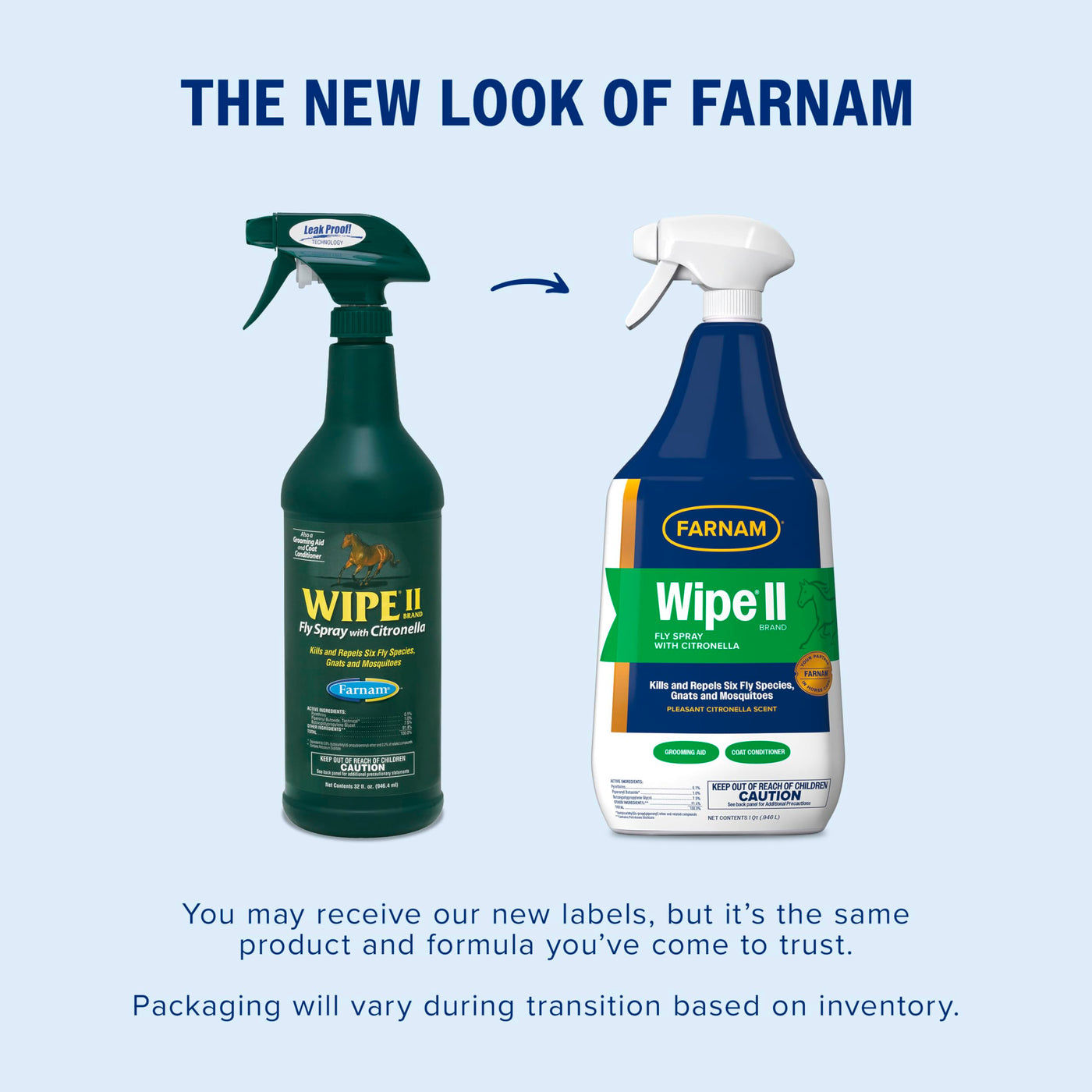 Farnam Wipe II Brand Horse Fly Spray with Citronella, Kills and Repels Flies, Conditions Coats, 32 oz