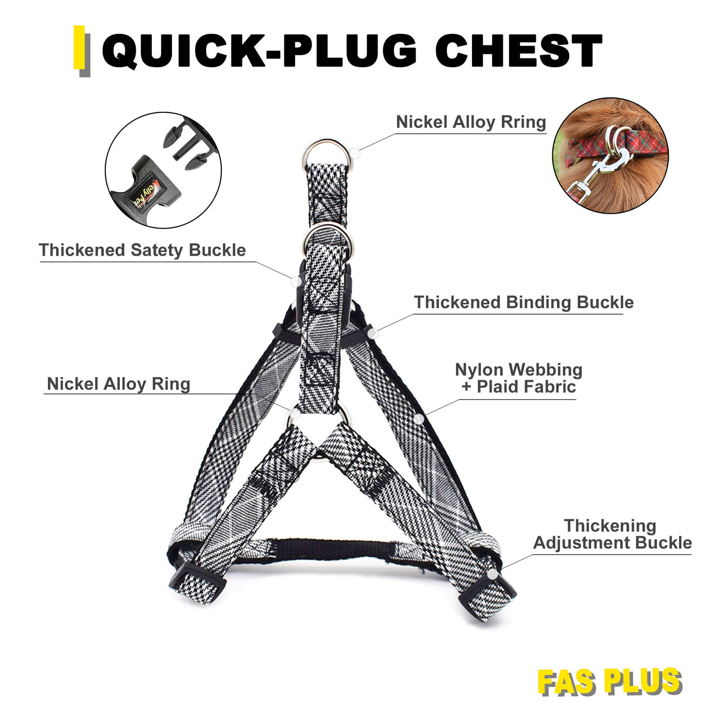 Q: What materials are used in the Fas Plus dog harness and leash set?A: The Fas Plus dog harness and leash set is made of high-quality cloth. This material is soft and comfortable for your pet while also being durable enough to withstand heavy pulling.