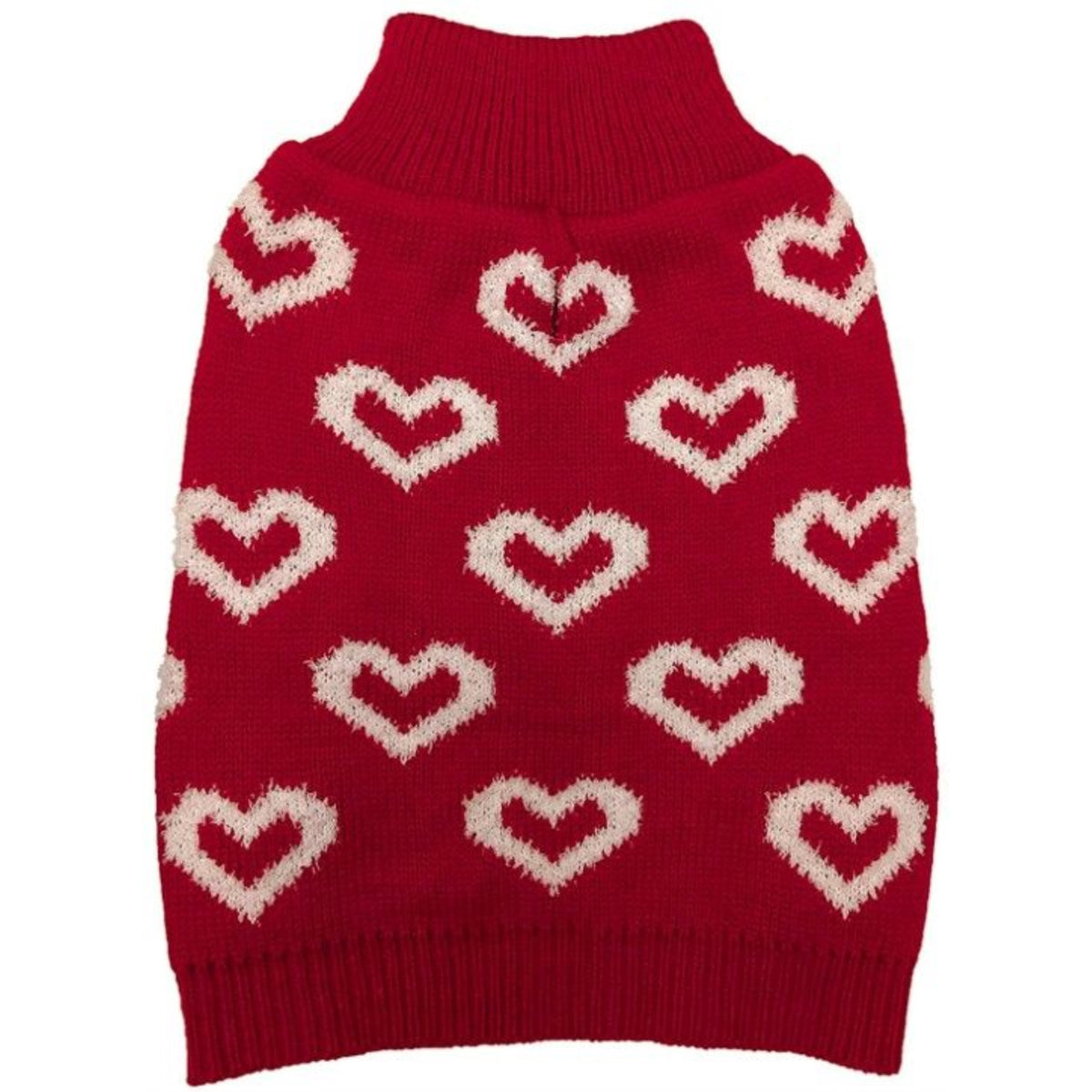 Fashion Pet All Over Hearts Dog Sweater Red. This adorable dual texture sweater is Soft and cozy. Features puffy chenille hearts on an acrylic knit background. Mock neck turtleneck and leash hole.