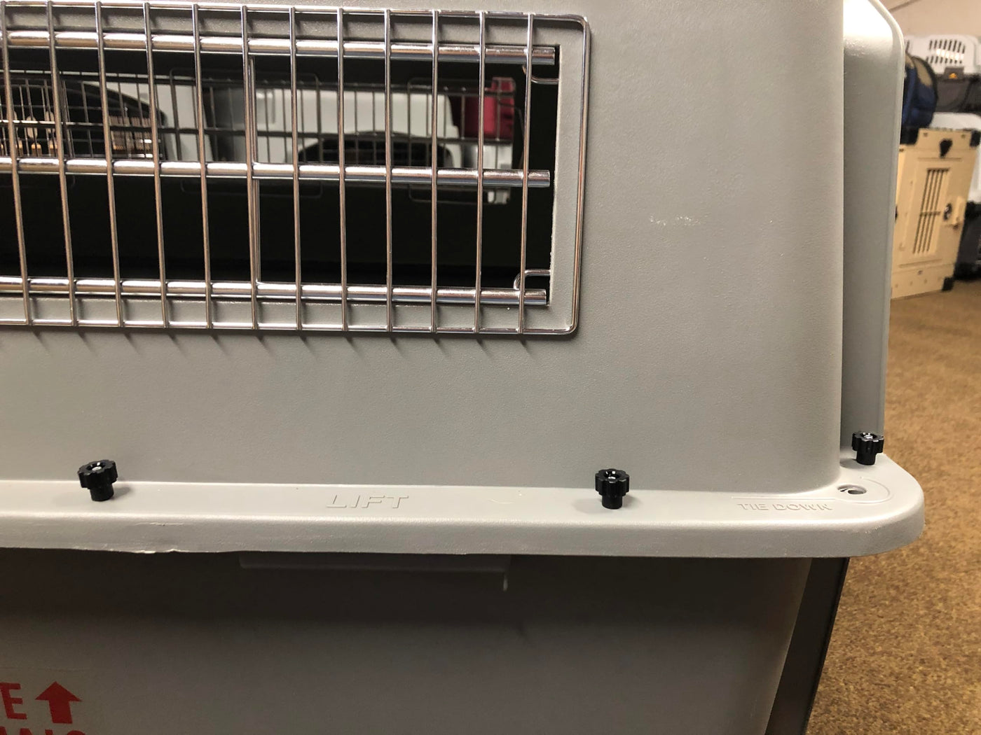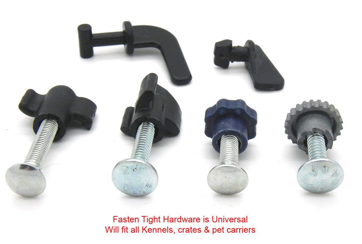 Kit Includes: (8) Black Nylon Plastic Thumb Nuts (8) 7/8' Long Bolts for older style Kennels (prior 2006) (8) 1-1/4' Long Bolts for New Style Kennels (after 2006) (8) 1-3/4' Long Bolts for Navigator, Compass and Grreat Choice Kennels Universal Replacement pet carrier attachments- Hardware (Nuts & Bolts) 1 size Fits ALL, Black Plastic Thumb Nuts & Metal Bolts for securing your pets airline Crate, carrier or kennel. Replaces missing bolts or faulty plastic peg attachments, an absolute necessity for pets traveling in the cargo area of the plane and required by airlines. Keeps pets safe and secure while traveling. Fits ALL pet Carriers, Dog Crates and Kennels including Petmate Vari Kennels, Sky Kennels, Navigator, Compass, Grreat Choice and Pet Taxis Pet Shuttle or Any Doskocil or Petmate Brand. Also fits and replaces plastic pegs of Travel Aire, Remington, Plasticrate, Rover, WILL NOT FIT SKUDO, KONG OR MARCHIORO which are not recommended for airline travel!
