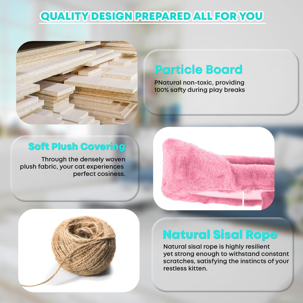 Q: What materials is the FDW Cat Tree made of?A: The FDW Cat Tree is constructed from high-quality particleboard and features a plush faux-fur cover for comfort. Its scratching posts are wrapped in durable sisal, encouraging healthy scratching habits for your cat.