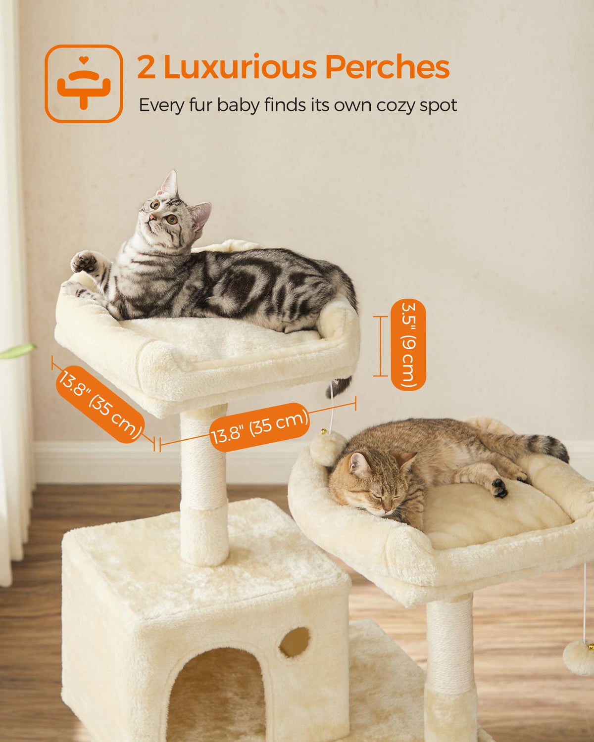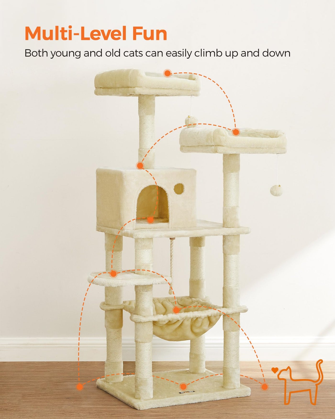 [For Multi-Cat Households] Featuring 2 luxurious top perches with padded edges and a comfy cat cave, this cat tree offers multiple cozy places for each of your little furballs to nap and relax | [Hammock, More Stable Than Ever] Supported by a robust steel frame fixed to 4 strong posts, this large, fluffy hammock is even more stable and comfortable than before. Your cats will love to jump in and lounge with peace of mind | [11 Scratching Posts] Cats love to scratch. With scratching posts on each level, they can scratch to their hearts content and let your sofa go! | [2 Pompoms, 1 Play Rope] 2 hanging pompoms with bells and a sisal rope encourage your little hunters to stretch, bat, and swat for endless entertainment. Additionally, 2 spare pompoms without bells are included as a silent option | [Multi-Level Cat Playground] Designed with multiple levels, this cat tower makes it easy for both young and elderly cats to climb and explore the vertical space, satisfying their natural instincts and activity needs