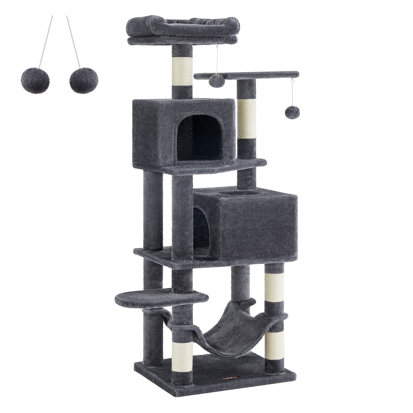 [2 Perches, 2 Caves] This cat tree boasts two luxurious top perches and two spacious cat caves, providing multiple comfy spots for cats to unwind and observe from—perfect for multi-cat households | [Multi-Level Cat Playground] Designed with multiple levels, this cat tower makes it easy for cats to climb and explore the vertical space, satisfying their natural instincts and activity needs | [Easy to Assemble] Thanks to the universal screws and simple structure, it takes only the included Allen hex key and one person to set up this cat condo | [2 Pompoms, Double the Fun] 2 hanging pompoms with bells encourage your little hunters to stretch, bat, and swat for endless entertainment. Additionally, 2 spare pompoms without bells are included as a silent option | [Sturdy and Secure] Supported by a strong structure and secured with an anti-tip kit, this cat tree is strong and safe for up to 5 cats (max. 11 lb each) to climb and play with peace of mind | [Easy to Clean] Fur, dirt, and crumbs...no worries. Just a lint roller or vacuum cleaner can easily wipe them away
