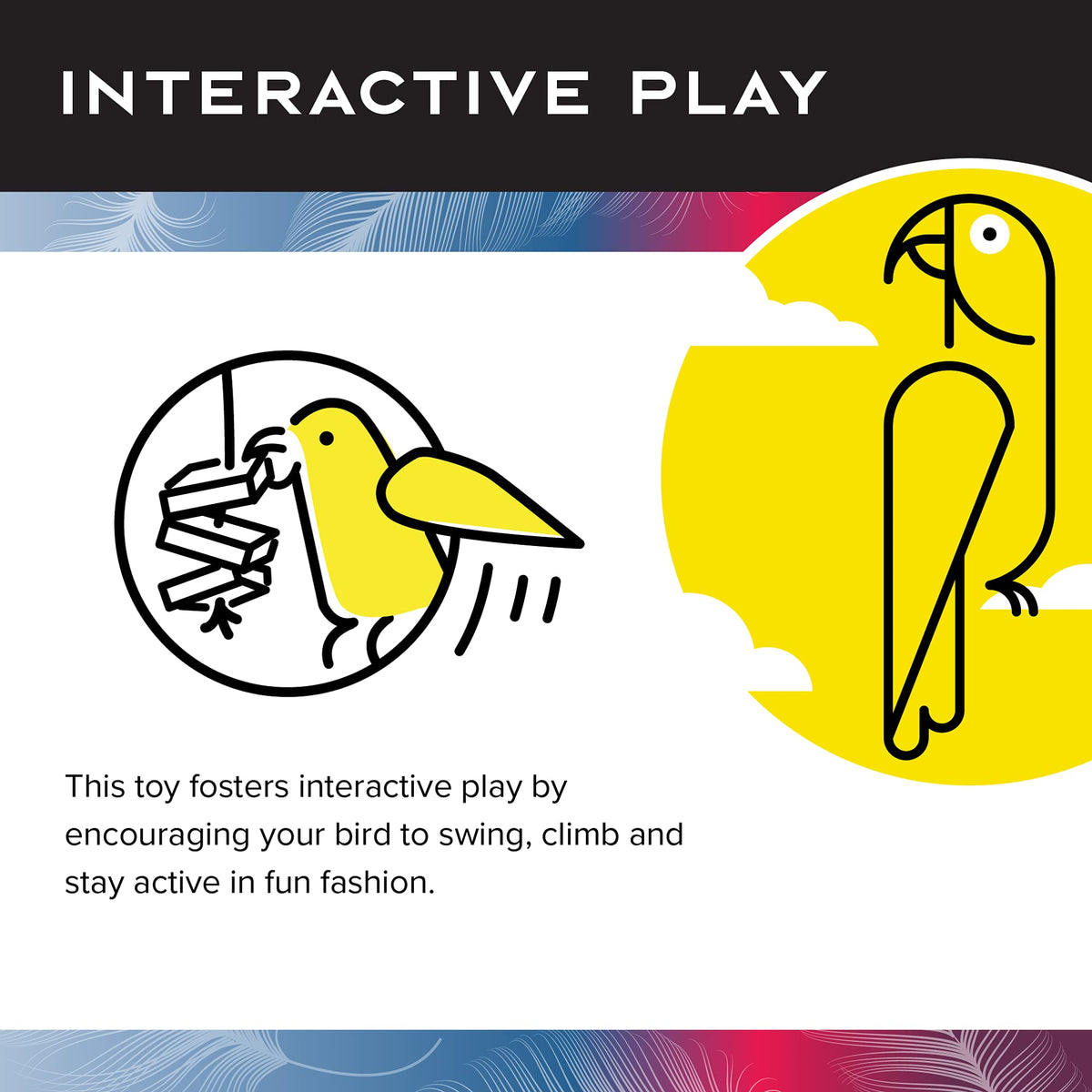 Q: What makes this bird toy engaging for my pet?A: The vibrant, multi-colored wooden blocks and the eye-catching movement of the Featherland Paradise toy capture your bird's attention, encouraging interactive play. This helps reduce boredom and stimulates your bird's natural instincts to swing, climb, chew, and shred.