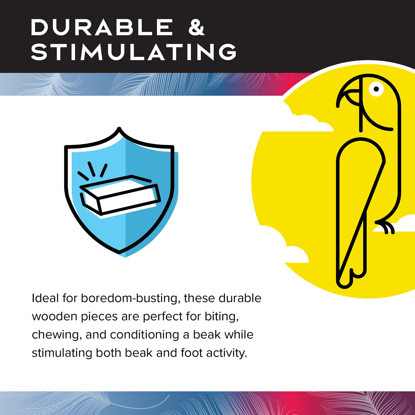 STIMULATING: Ideal for boredom busting, wooden pieces of these large bird toys are great for biting, chewing, and conditioning a beak while stimulating both beak and foot activity | ENGAGING AND INTERACTIVE: Bright, multi-colored wooden blocks on this hanging toy will keep your bird's attention for hours! The eye-catching movement, sounds, and vibrant colors of these parrot toys for large birds will foster interactive play and encourage your bird to swing, climb, chew, and shred | SIZED FOR YOUR BIRD: Designed specifically for medium to large birds, the Knots N Blocks toy measures 14.5 inches long and work great as Cockatoo toys, Macaw toys, toys for Amazons, Congo Greys, Eclectuses and other large bird breeds | DURABLE: Created from pet-safe materials such as entirely cotton rope, wood, and natural sisal rope, the materials used in these large parrot toys condition the beak while the fabric textures help stimulate both beak and foot activity | EASY INSTALLATION: The Knots N Blocks toy attaches easily to any cage with its quick link fastener, ensuring your bird can start playing as quickly as possible