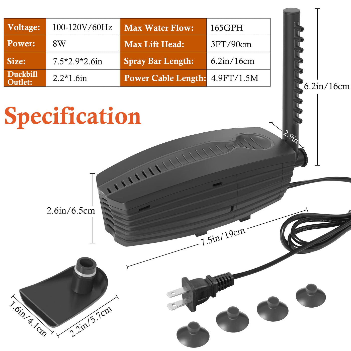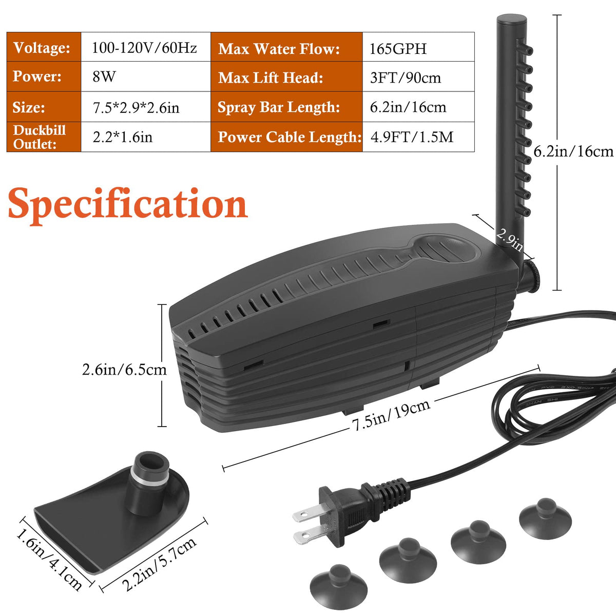 ?Specifications?Powerful aquarium internal filter Power: 8W Max Water Flow: 165GPH Size: 7.5*2.9*2.6in Length of the Spray Bar: 6.2in/16cm Length of the Power Cable: 4.9FT. Suitable for 10-50gallon fish and turtle tank.