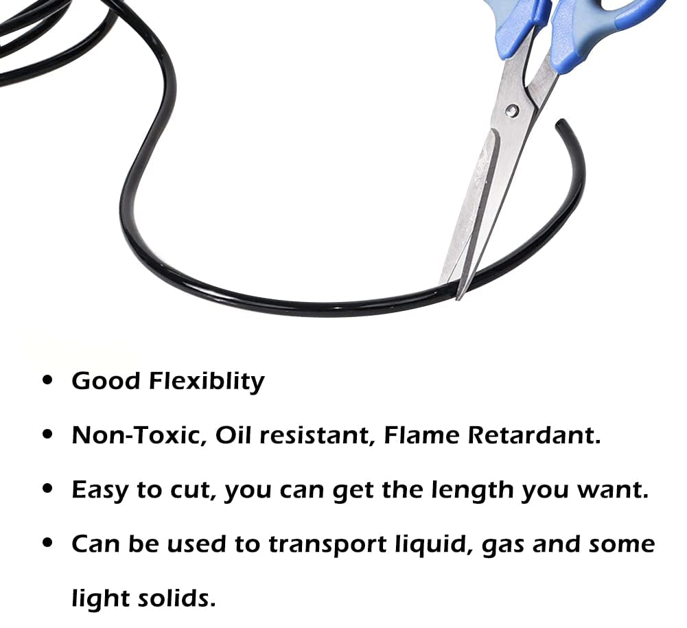 Feelers black PVC tubing is lightweight and flexible and is widely used in water gardens, aquariums, fish hatcheries and a multitude of orther indusrtries for transport of liquids, gases and some light solids. In addition, this PVC pipe is also suitable for drip irrigation system, and short distance plant irrigation is not a problem. Excellent aging resistant performance, long-term use without being aged. The dimensions 5.3mm ID x 7.3 mm OD, 6.4mm ID x 9.5 mm OD are suitable for use as replacement tubes for stethoscopes and also for use in other medical devices. Note: This hose is industrial grade hose, not food grade hose. Easy to use, trimming or cutting it is simple.