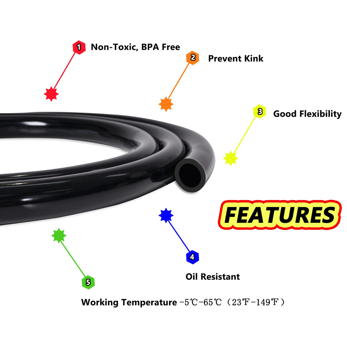 Feelers black PVC tubing is lightweight and flexible and is widely used in water gardens, aquariums, fish hatcheries and a multitude of orther indusrtries for transport of liquids, gases and some light solids. In addition, this PVC pipe is also suitable for drip irrigation system, and short distance plant irrigation is not a problem. Excellent aging resistant performance, long-term use without being aged. The dimensions 5.3mm ID x 7.3 mm OD, 6.4mm ID x 9.5 mm OD are suitable for use as replacement tubes for stethoscopes and also for use in other medical devices. Note: This hose is industrial grade hose, not food grade hose. Easy to use, trimming or cutting it is simple.