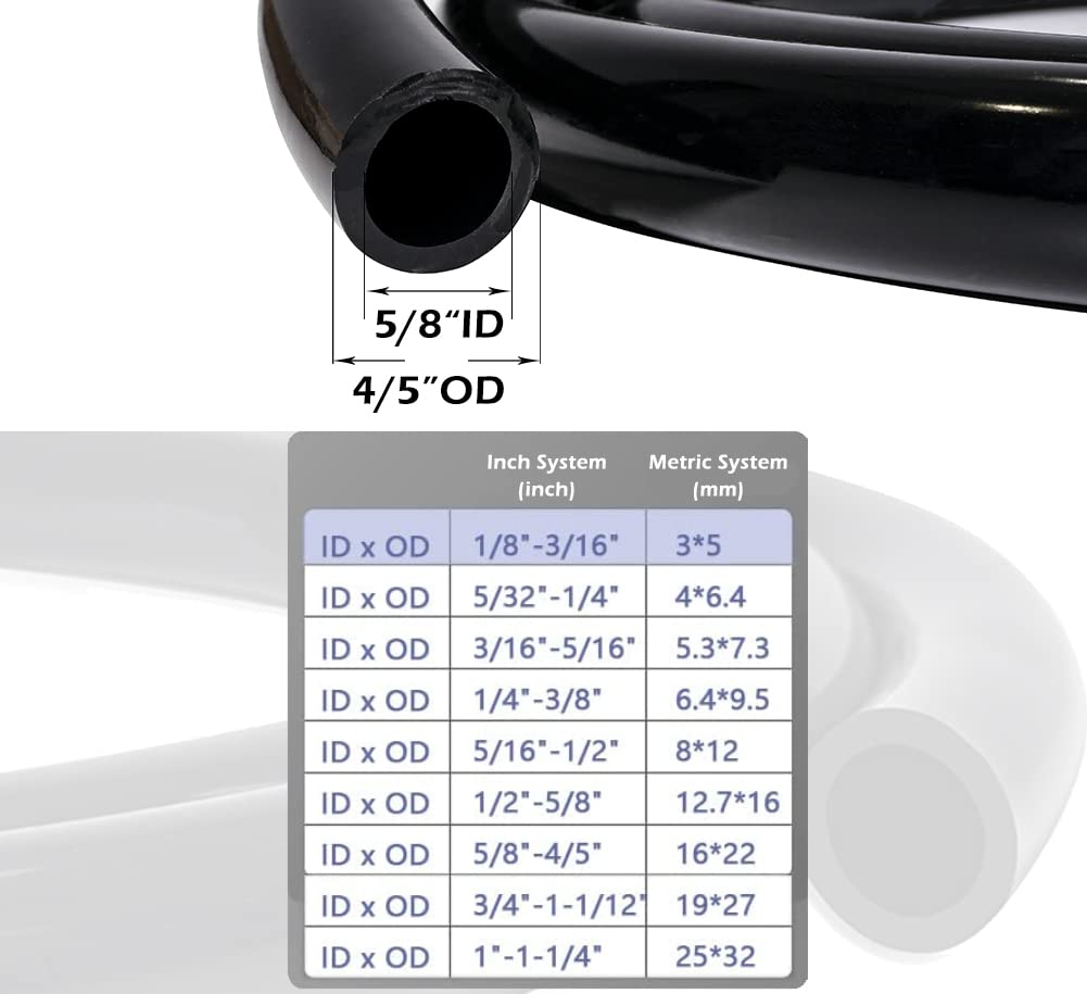Feelers black PVC tubing is lightweight and flexible and is widely used in water gardens, aquariums, fish hatcheries and a multitude of orther indusrtries for transport of liquids, gases and some light solids. In addition, this PVC pipe is also suitable for drip irrigation system, and short distance plant irrigation is not a problem. Excellent aging resistant performance, long-term use without being aged. The dimensions 5.3mm ID x 7.3 mm OD, 6.4mm ID x 9.5 mm OD are suitable for use as replacement tubes for stethoscopes and also for use in other medical devices. Note: This hose is industrial grade hose, not food grade hose. Easy to use, trimming or cutting it is simple.