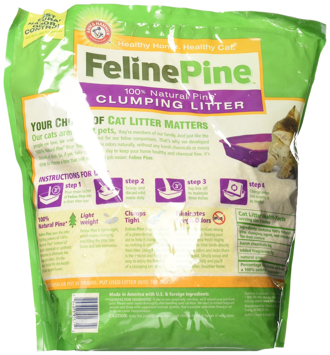 Q: How does Feline Pine Clumping Litter control odors?A: Feline Pine Clumping Litter utilizes a powerful formula of heavy-duty odor eliminators combined with Arm & Hammer Baking Soda. This formula not only seals odors but also destroys them on contact, ensuring that your home stays fresh for up to 7 days.