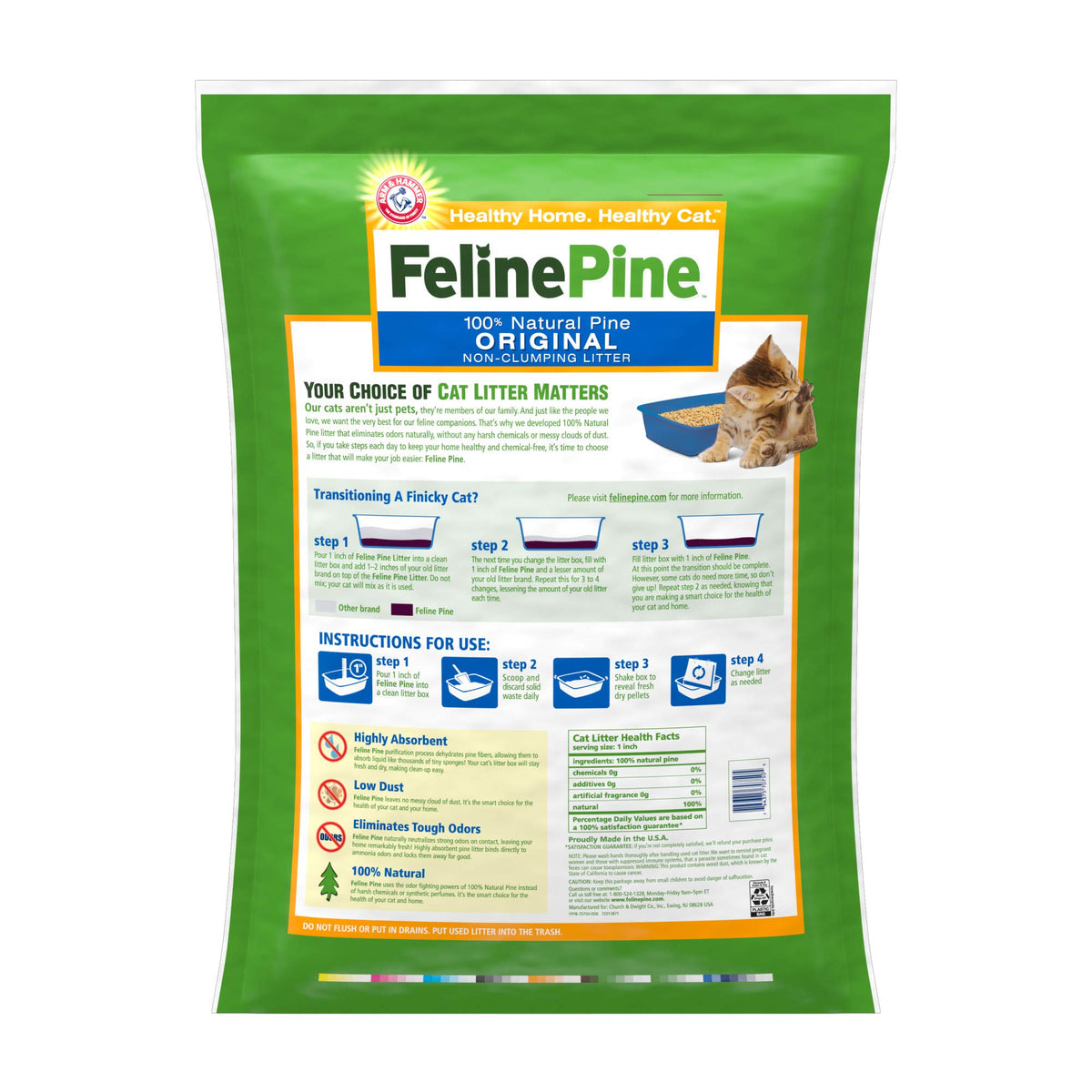 Q: What are the benefits of using Feline Pine Original Cat Litter?A: Feline Pine Original Cat Litter is made from 100% natural pine, which effectively destroys odors without the use of perfumes or additives. It is chemical-free and safe for your cat, making it a healthy choice for both your feline friend and your home.