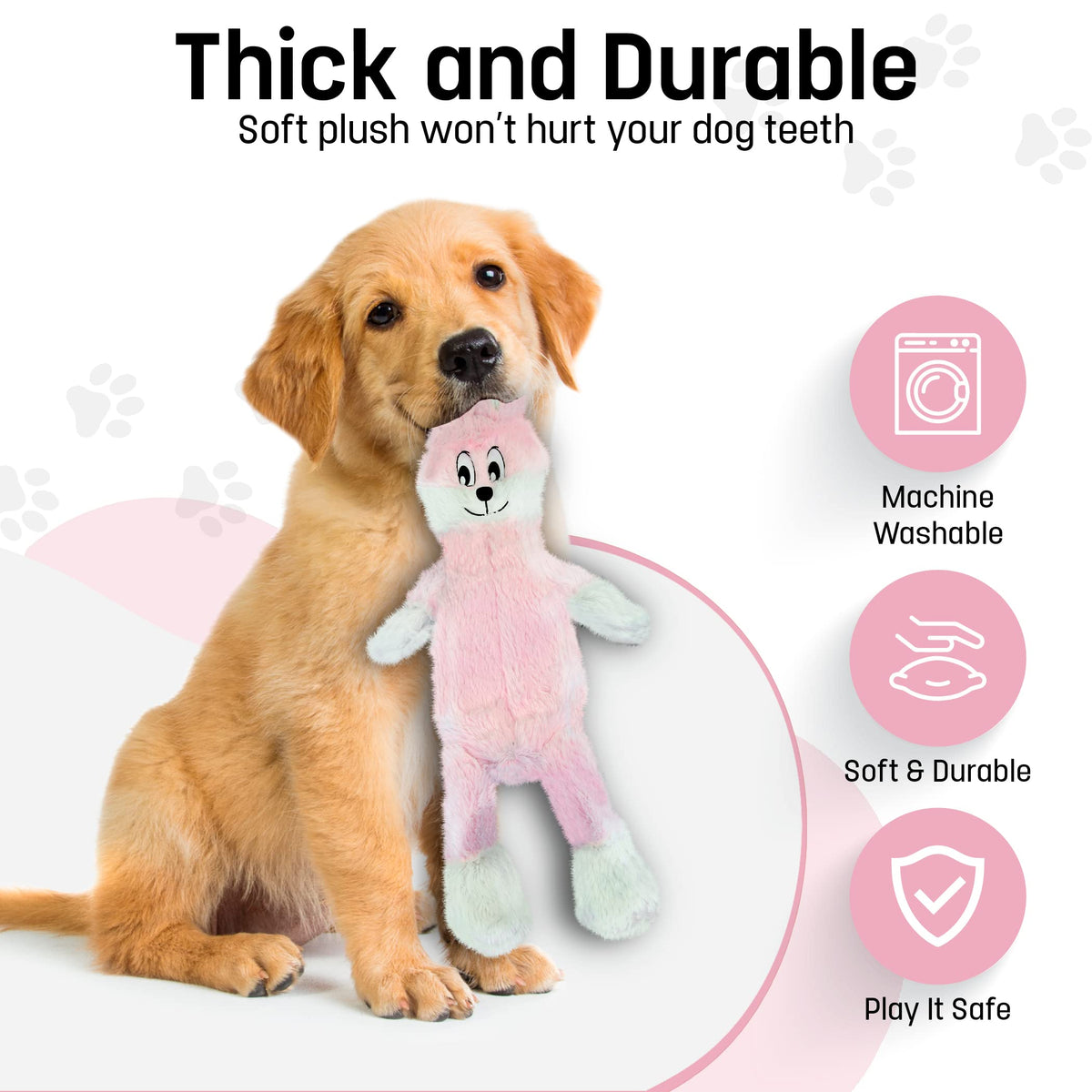 Q: What are the benefits of a no-stuffing dog toy?A: A no-stuffing dog toy like the FGA MARKETPLACE Pink Rabbit prevents messes, as there is no stuffing to leak out during play. This makes clean-up easier for pet owners.