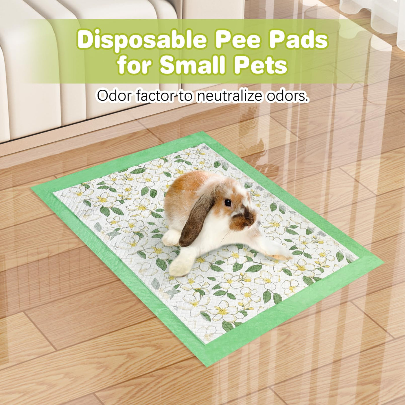 Small Animal Disposable Pee Pads Super absorbent & odor control Guinea pig liners have an embossed mesh surface for quick dispersion of liquids; wood pulp cotton and SAP polymer absorb liquids into a gel; a water locking layer keeps liquids impermeable; and a PE leak-proof bottom membrane prevents liquids from seeping out, helping to protect the bottom of the cage and keep floors neat and tidy. Newly upgraded small animal cage liners camellia fresh scent neutralizes odors and brings freshness and cleanliness to guinea pigs' living space. SPECIFICATIONS: Material: SAP polymer, wood pulp cotton, non-woven fabric, PE Color: green Size: 18'' x 24'' Packing quantity: 50 PCS Super Absorbent When liquid comes into contact with bunny cage liner, the SAP polymer absorbs the liquid and turns into a gel, easily locking in moisture and keeping your little pet's feet away from moisture. PE Waterproof Base Film The PE bottom membrane of guinea pig liners for cage keeps urine on the liner without seeping out, helping to protect the bottom of the cage and keep the floor tidy. Camellia Flower Print The eye-catching print helps pets to toilet at regular places, the wider sides prevent urine from leaking onto the floor, and the lovely natural scent of camellia flowers keeps the air in the guinea pig's cage clean and fresh.