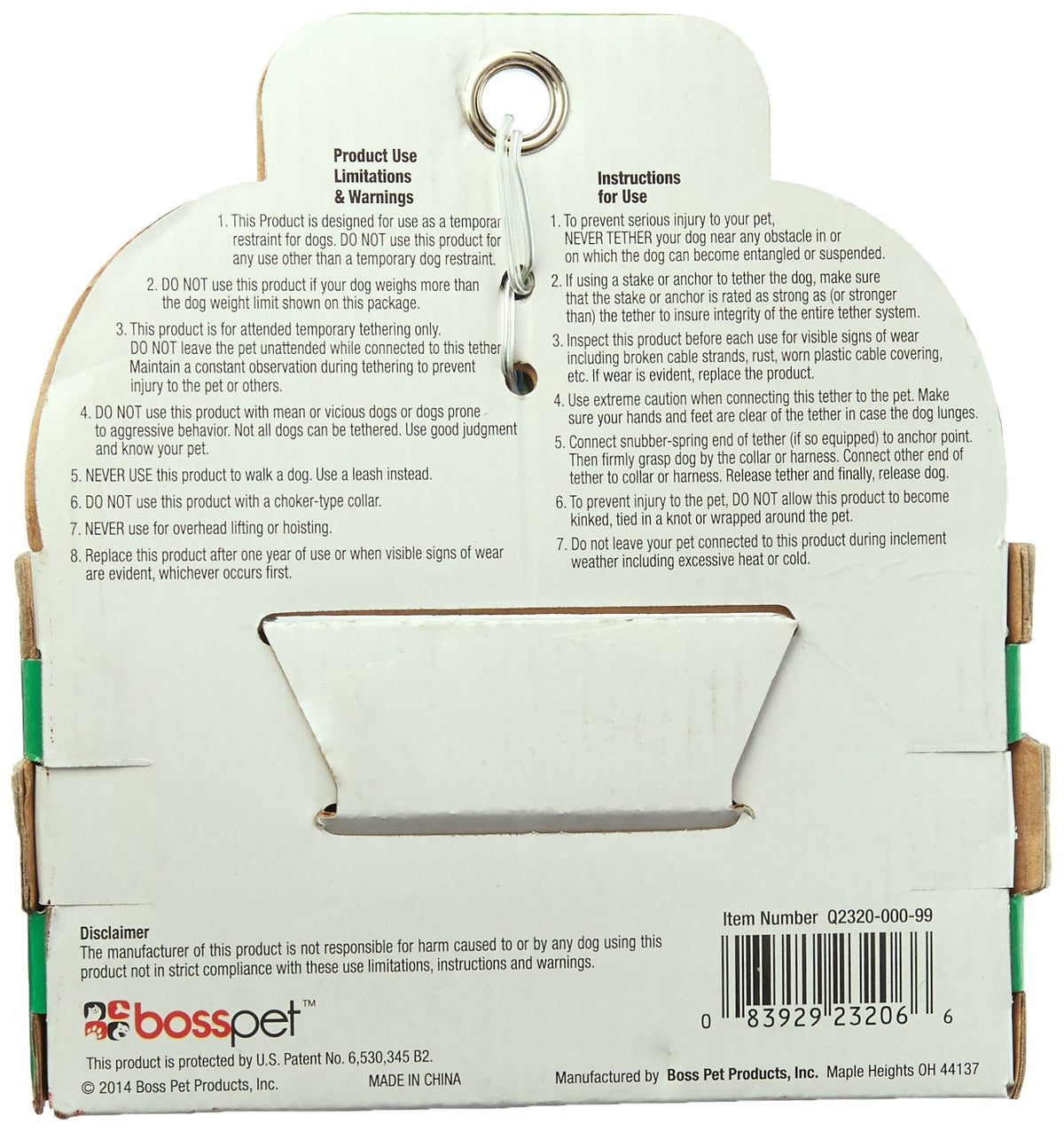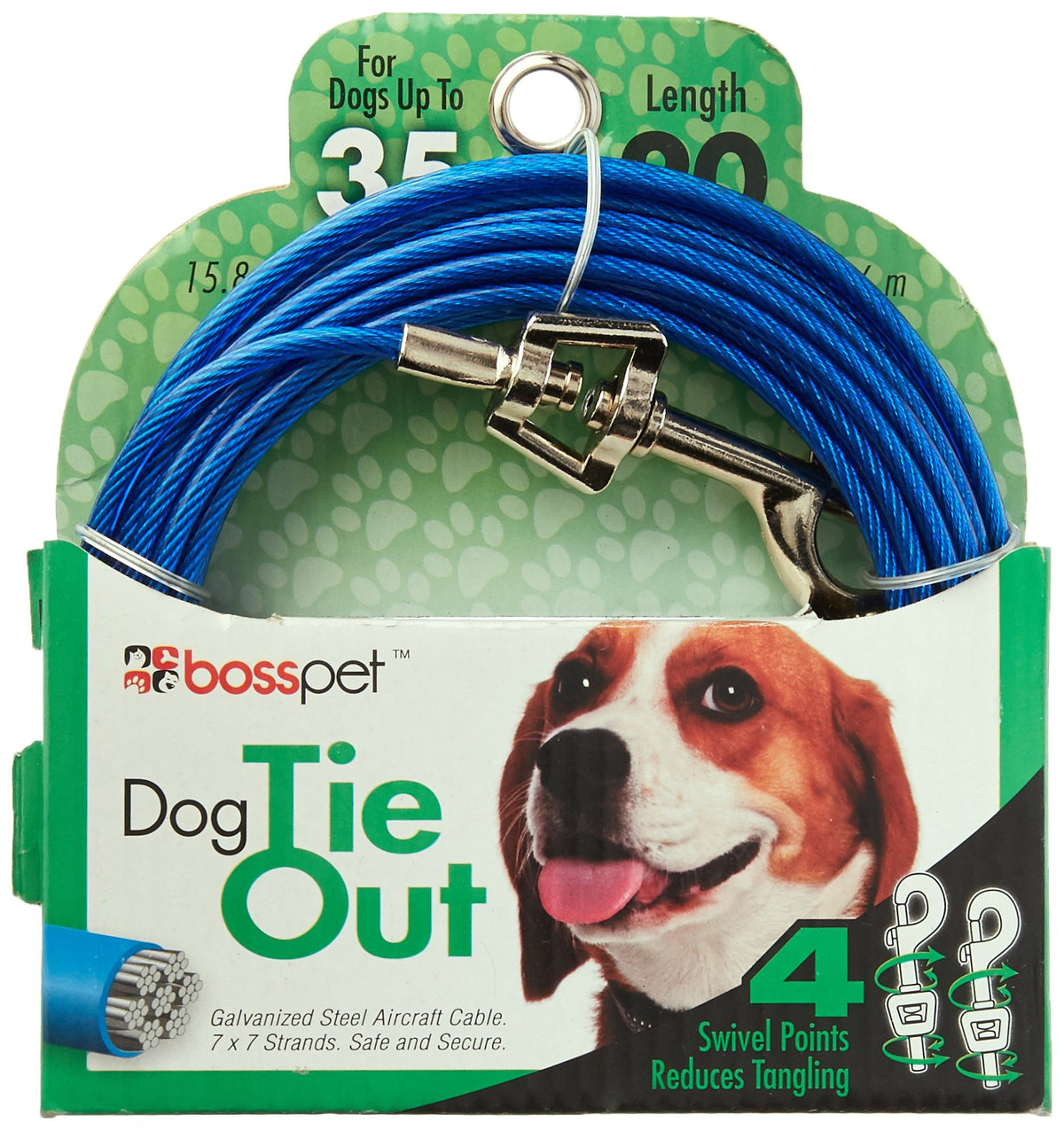 Q: Does the tie-out cable come with any special features?A: Yes, it features swivel snaps on both ends to prevent tangling and is lightweight, making it easy to use.