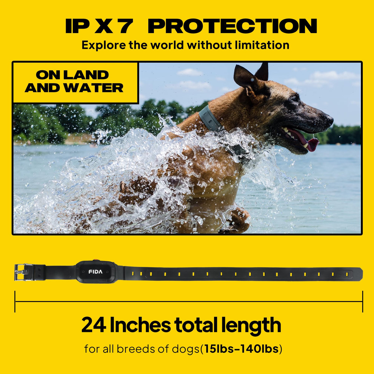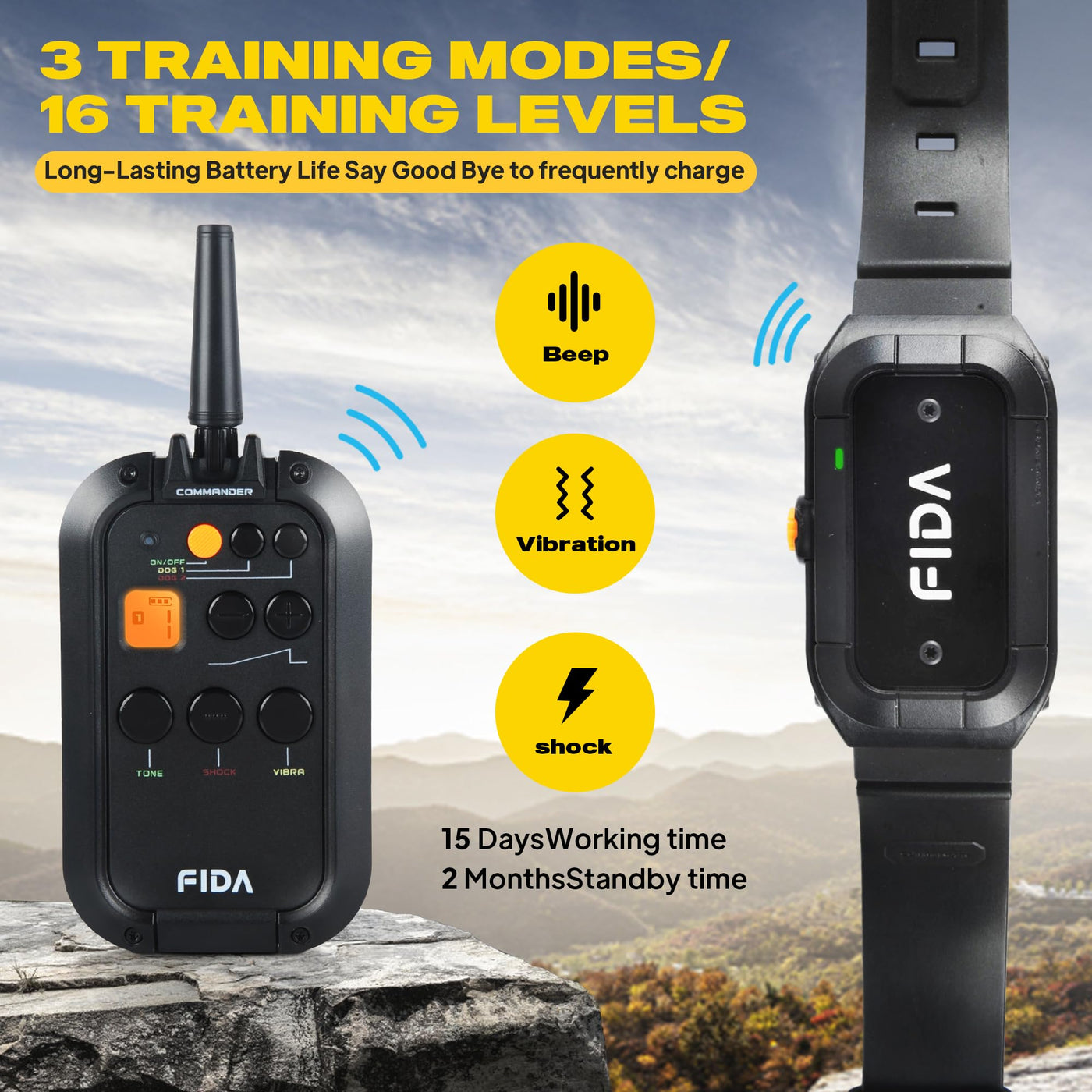 Fida Dog Shock Collar With Remote 3/4 Mile Range E Collar For Dogs Training, Ipx7 Waterproof Rechargeable Dog Training Collar For Medium Large Dogs(15-260Lbs) Humane Design With 3 Modes: Viberation/Beep/Safe Shock(16 Levels)