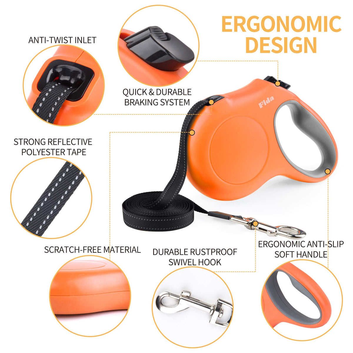 Q: How long is the Fida Retractable Dog Leash?A: The leash extends up to 16 feet, providing ample space for your dog to roam while still maintaining control.