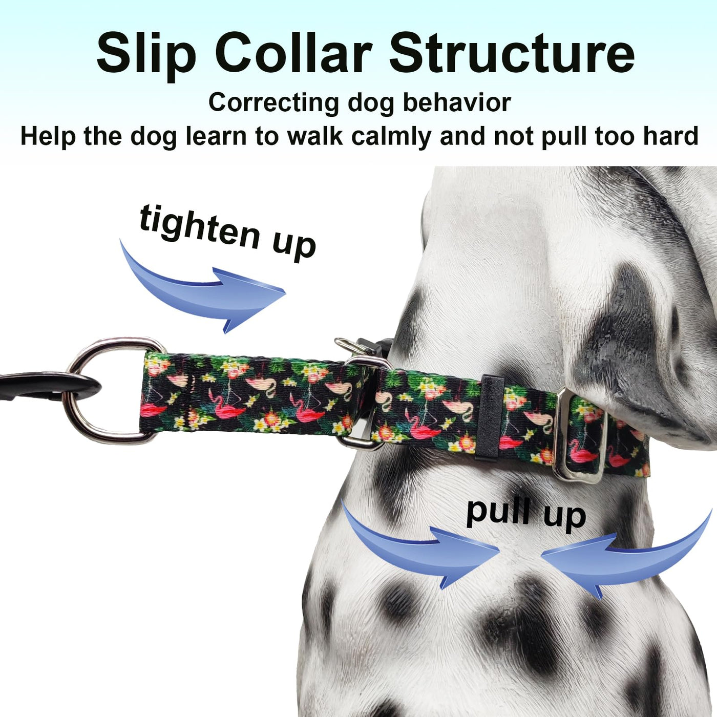 Matters Needing Attention: 1. Do Not Wear It For A Long Time: Avoid Letting Dogs Wear Slip Collars For A Long Time, Especially Indoors Or While Sleeping. 2. Check For Wear: Regularly Inspect The Martingale Collar For Signs Of Wear Or Damage And Replace It Promptly. 3. Avoid Overuse: Do Not Use No Pull Dog Collar During Intense Exercise Or Play With Dogs To Avoid Entanglement. 4. Through Proper Use And Appropriate Training, Nylon Escape Proof Dog Collars Can Become An Effective Tool For Managing Dog Behavior And Controlling Tension.Slip Collar Is Suitable For Small, Medium, And Large Dogs Size Information: S: 3/4''Width, Adjustable Length, 11''-14'' M: 1''Width, Adjustable Length, 13.4''-18'' L: 1''Width, Adjustable Length, 16''-24'' Brand Offer Different Styles And Colors, Including Purple, Orange, Pink, Black, Blue, Green, Yellow, White, Red, Including Flamingo, Strawberry, Butterfly, Checkered, Arrow, Plam Leaf, Floral, Flowers And Other Patterns.Our Breakaway Dog Collar Are Perfect For Dogs And Cats To Wear, And Are A Daily Pet Supplies For Dogs And The Best Gift For Pets. Such As Doberman Dachshund, German Shepherd, Husky, Pitbull, Bulldog, Frenchie Retriever, Greyhound, Foggy, Service, Deaf Dogs. Usage Scenarios: Suitable For Walking, Training, Work, Hunting, Camping, Etc