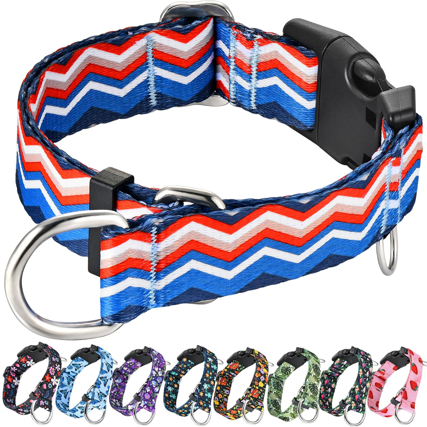 Matters Needing Attention: 1. Do Not Wear It For A Long Time: Avoid Letting Dogs Wear Slip Collars For A Long Time, Especially Indoors Or While Sleeping. 2. Check For Wear: Regularly Inspect The Martingale Collar For Signs Of Wear Or Damage And Replace It Promptly. 3. Avoid Overuse: Do Not Use No Pull Dog Collar During Intense Exercise Or Play With Dogs To Avoid Entanglement. 4. Through Proper Use And Appropriate Training, Nylon Escape Proof Dog Collars Can Become An Effective Tool For Managing Dog Behavior And Controlling Tension.Slip Collar Is Suitable For Small, Medium, And Large Dogs Size Information: S: 3/4''Width, Adjustable Length, 11''-14'' M: 1''Width, Adjustable Length, 13.4''-18'' L: 1''Width, Adjustable Length, 16''-24'' Brand Offer Different Styles And Colors, Including Purple, Orange, Pink, Black, Blue, Green, Yellow, White, Red, Including Flamingo, Strawberry, Butterfly, Checkered, Arrow, Plam Leaf, Floral, Flowers And Other Patterns.Our Breakaway Dog Collar Are Perfect For Dogs And Cats To Wear, And Are A Daily Pet Supplies For Dogs And The Best Gift For Pets. Such As Doberman Dachshund, German Shepherd, Husky, Pitbull, Bulldog, Frenchie Retriever, Greyhound, Foggy, Service, Deaf Dogs. Usage Scenarios: Suitable For Walking, Training, Work, Hunting, Camping, Etc