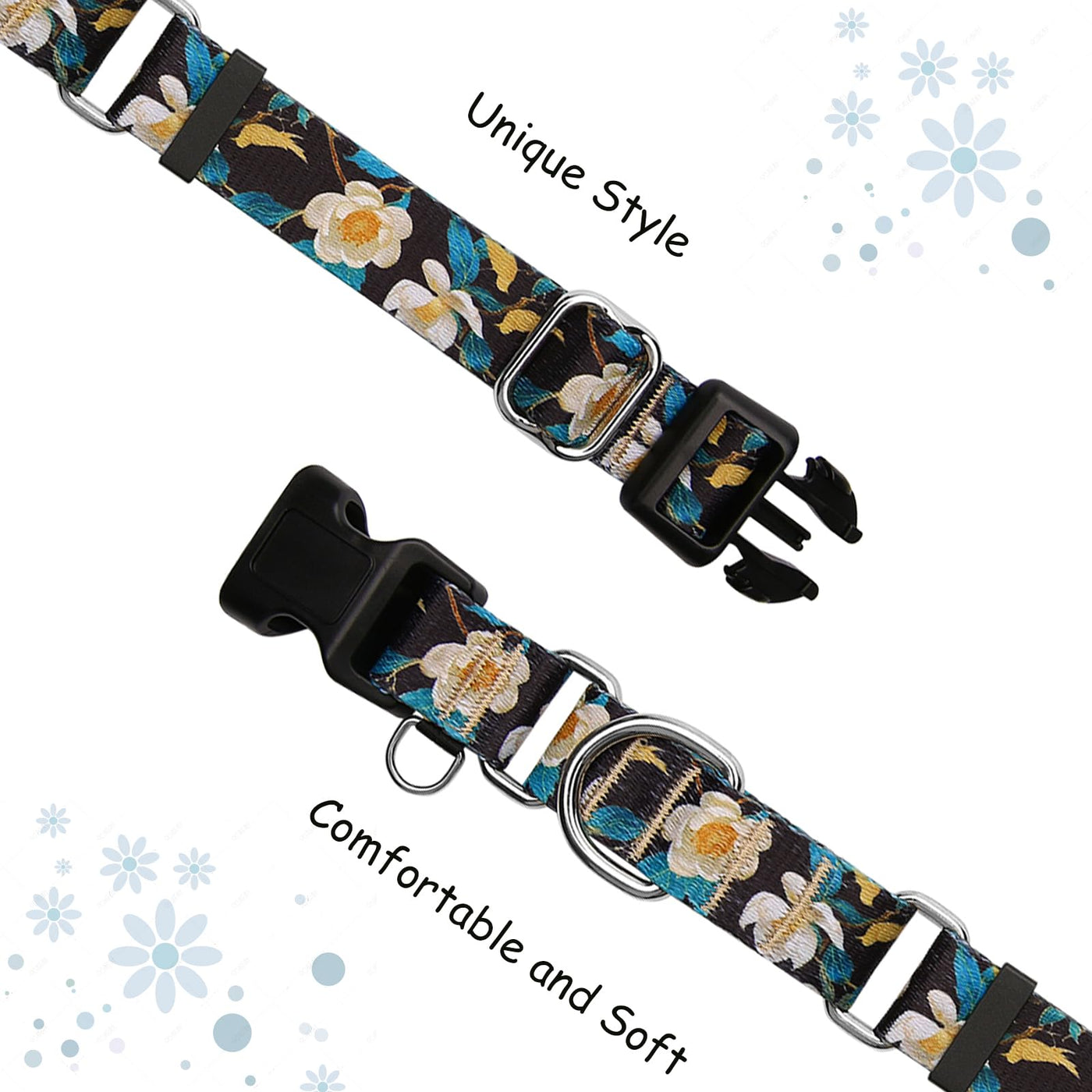 Matters needing attention: 1. Do not wear it for a long time: Avoid letting dogs wear Martingale collars for a long time, especially indoors or while sleeping. 2. Check for wear: Regularly inspect the dog martingale collar for signs of wear or damage and replace it promptly. 3. Avoid overuse: Do not use dog collar martingale during intense exercise or play with dogs to avoid entanglement. 4. Through proper use and appropriate training, nylon Martingale dog collars can become an effective tool for managing dog behavior and controlling tension.Martingale is suitable for small, medium, and large dogs Size Information: XS: 3/5width, adjustable length, 9-10.6 S: 3/4width, adjustable length, 10.2-12.2 M: 1width, adjustable length, 12.4-15.7 L: 1width, adjustable length, 15.4-21.9 XL: 1width, adjustable length, 18.9-28 Brand offer different styles and colors, including purple, lavender, pink, black, blue, green, yellow, white, gold, red, including plaid, mountain, rose, shark, maple leaf, mushroom, lily, sunflower, daisy, floral, flowers and other patterns.Our breakaway dog collar are perfect for dogs and cats to wear, and are a daily pet supplies for dogs and the best gift for pets. Such as doberman dachshund, german shepherd, husky, pitbull, bulldog, frenchie retriever, greyhound, foggy, service, deaf dogs. Usage scenarios: Suitable for walking, training, work, hunting, camping, etc