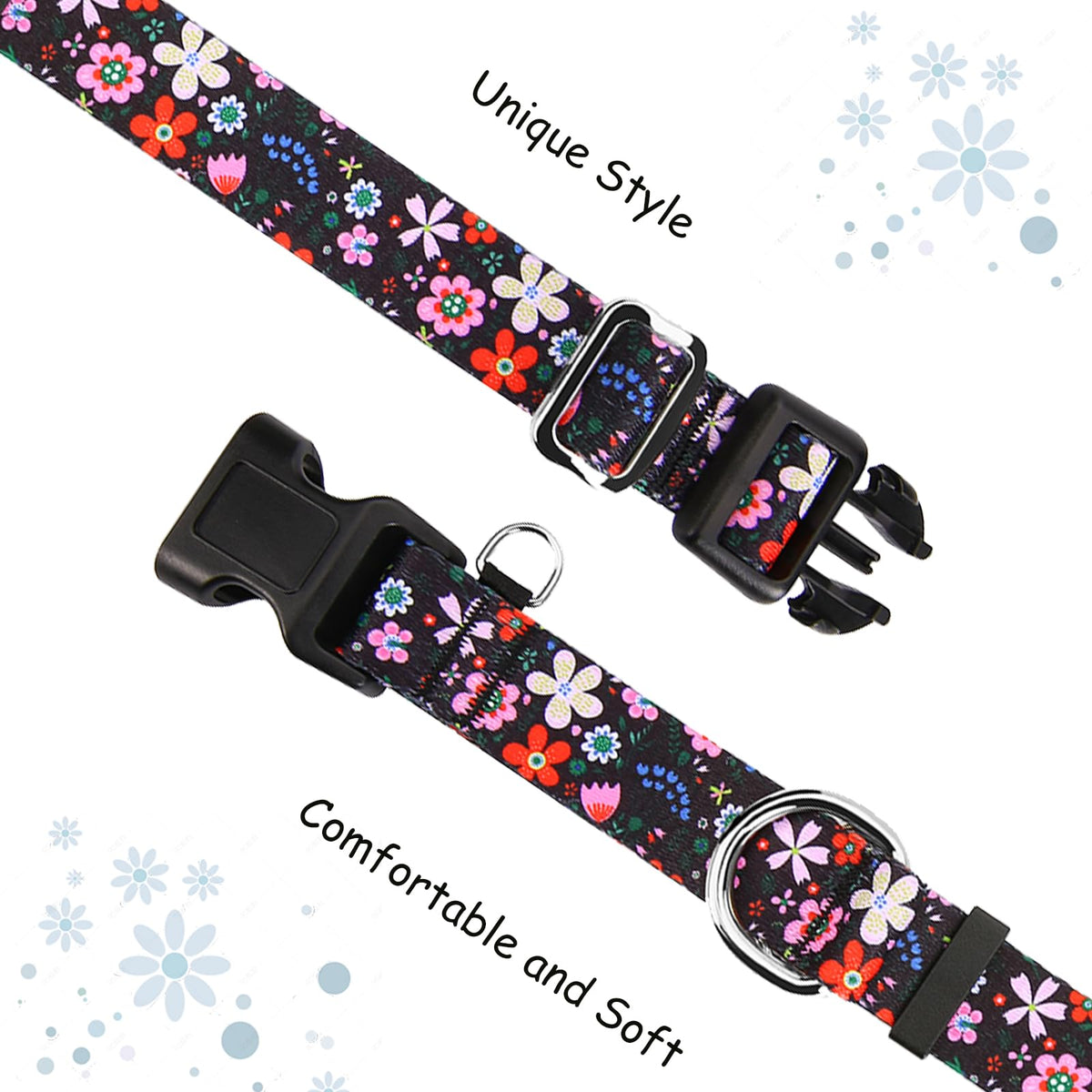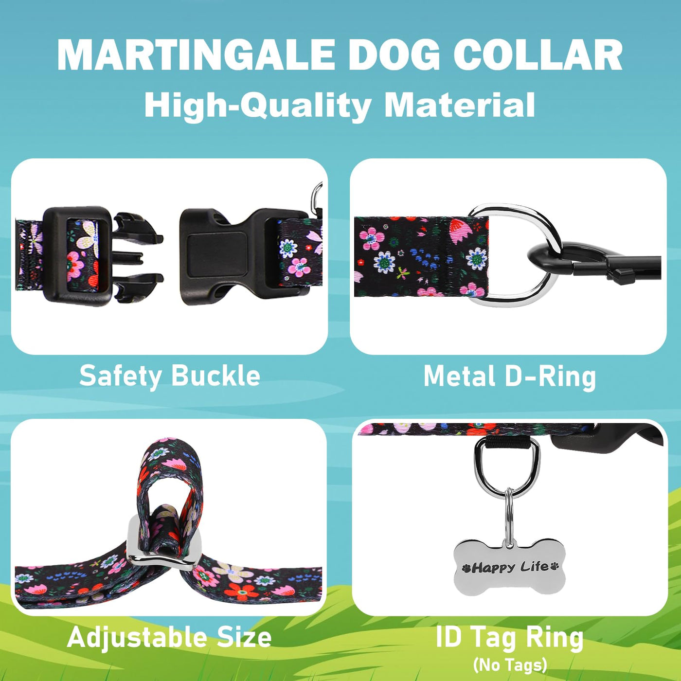 Fidohug Martingale Dog Collar With Buckle Adjustable Nylon Limited Slip No Pull Training Floral Dog Collars (Black Pink Red, Med