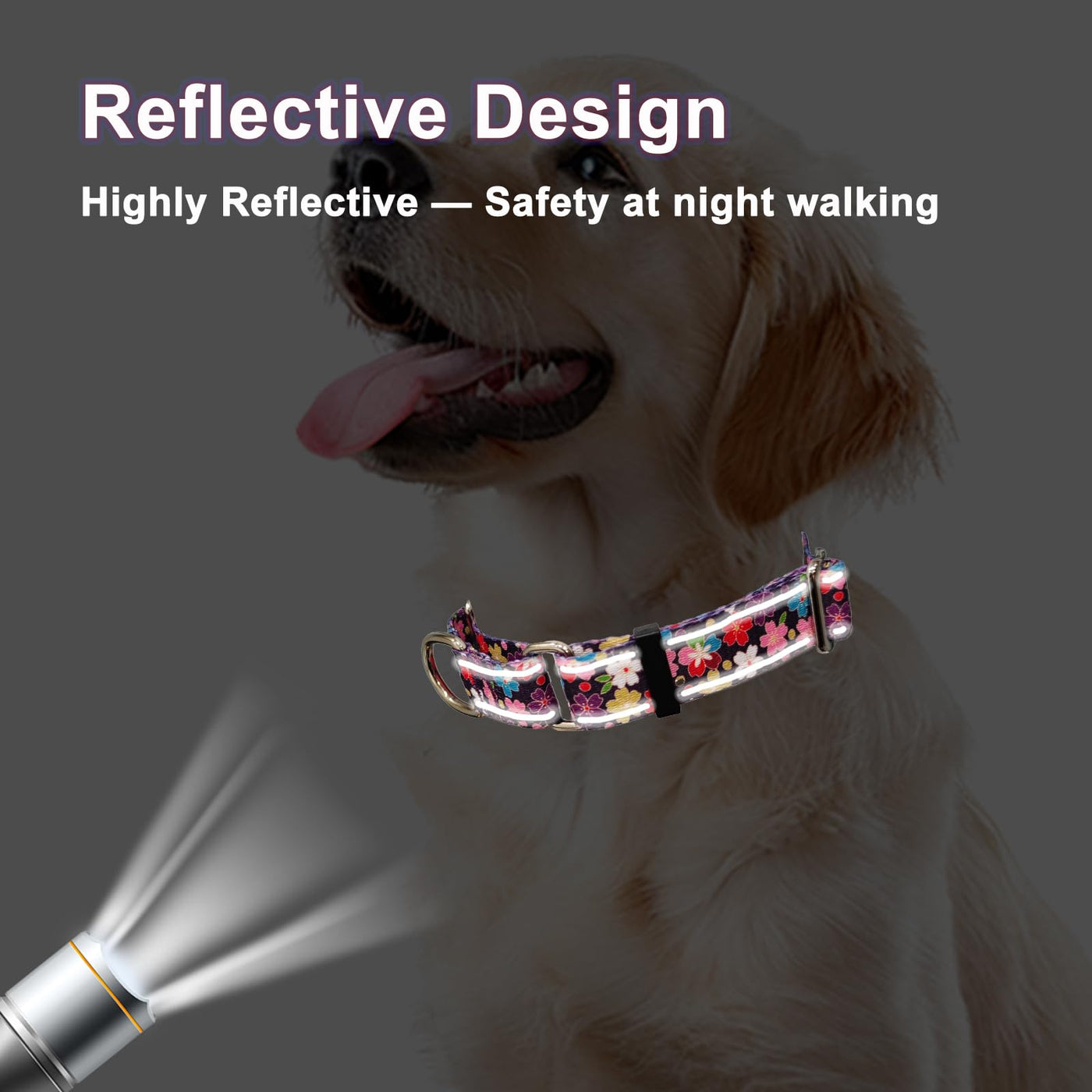 Matters Needing Attention: 1. Do Not Wear It For A Long Time: Avoid Letting Dogs Wear Martingale Collars For A Long Time, Especially Indoors Or While Sleeping. 2. Check For Wear: Regularly Inspect The Dog Martingale Collar For Signs Of Wear Or Damage And Replace It Promptly. 3. Avoid Overuse: Do Not Use Dog Collar Martingale During Intense Exercise Or Play With Dogs To Avoid Entanglement. 4. Through Proper Use And Appropriate Training, Nylon Martingale Dog Collars Can Become An Effective Tool For Managing Dog Behavior And Controlling Tension.Reflective Martingale Collar Is Suitable For Small, Medium, And Large Dogs Size Information: Xs: 3/5''Width, Adjustable Length, 10.3''-13'' S: 3/4''Width, Adjustable Length, 12.2''-15.7'' M: 1''Width, Adjustable Length, 14.3''-19'' L: 1''Width, Adjustable Length, 18''-26.3'' Brand Offer Different Styles And Colors, Including Purple, Lavender, Pink, Black, Blue, Green, Turquoise, Yellow, Multicoloured, White, Red, Including Stripe, Argyle, Geometric, Polka Dot, Waves, Shark, Starfish, Shell, Daisy, Floral, Flowers And Other Patterns.Our Breakaway Dog Collar Are Perfect For Dogs And Cats To Wear, And Are A Daily Pet Supplies For Dogs And The Best Gift For Pets. Such As Doberman Dachshund, German Shepherd, Husky, Pitbull, Bulldog, Frenchie Retriever, Greyhound, Foggy, Service, Deaf Dogs. Usage Scenarios: Suitable For Walking, Training, Work, Hunting, Camping, Etc