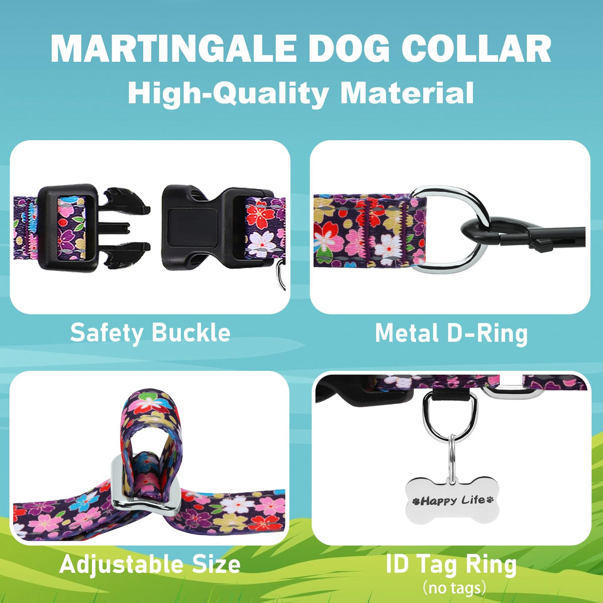 Matters Needing Attention: 1. Do Not Wear It For A Long Time: Avoid Letting Dogs Wear Martingale Collars For A Long Time, Especially Indoors Or While Sleeping. 2. Check For Wear: Regularly Inspect The Dog Martingale Collar For Signs Of Wear Or Damage And Replace It Promptly. 3. Avoid Overuse: Do Not Use Dog Collar Martingale During Intense Exercise Or Play With Dogs To Avoid Entanglement. 4. Through Proper Use And Appropriate Training, Nylon Martingale Dog Collars Can Become An Effective Tool For Managing Dog Behavior And Controlling Tension.Reflective Martingale Collar Is Suitable For Small, Medium, And Large Dogs Size Information: Xs: 3/5''Width, Adjustable Length, 10.3''-13'' S: 3/4''Width, Adjustable Length, 12.2''-15.7'' M: 1''Width, Adjustable Length, 14.3''-19'' L: 1''Width, Adjustable Length, 18''-26.3'' Brand Offer Different Styles And Colors, Including Purple, Lavender, Pink, Black, Blue, Green, Turquoise, Yellow, Multicoloured, White, Red, Including Stripe, Argyle, Geometric, Polka Dot, Waves, Shark, Starfish, Shell, Daisy, Floral, Flowers And Other Patterns.Our Breakaway Dog Collar Are Perfect For Dogs And Cats To Wear, And Are A Daily Pet Supplies For Dogs And The Best Gift For Pets. Such As Doberman Dachshund, German Shepherd, Husky, Pitbull, Bulldog, Frenchie Retriever, Greyhound, Foggy, Service, Deaf Dogs. Usage Scenarios: Suitable For Walking, Training, Work, Hunting, Camping, Etc