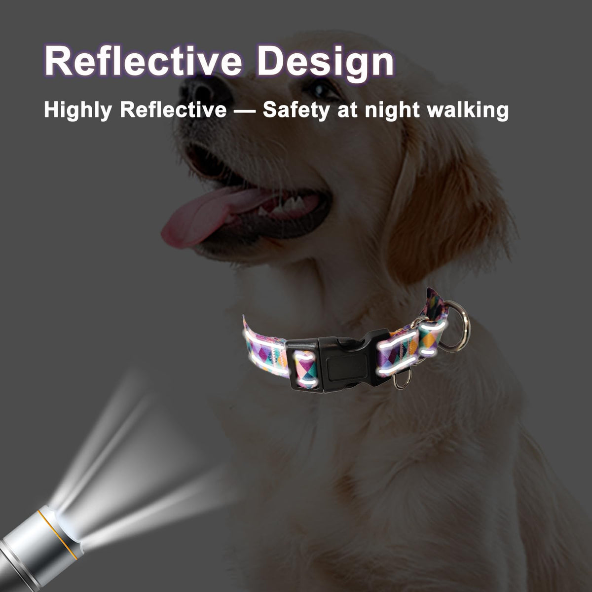 Matters Needing Attention: 1. Do Not Wear It For A Long Time: Avoid Letting Dogs Wear Martingale Collars For A Long Time, Especially Indoors Or While Sleeping. 2. Check For Wear: Regularly Inspect The Dog Martingale Collar For Signs Of Wear Or Damage And Replace It Promptly. 3. Avoid Overuse: Do Not Use Dog Collar Martingale During Intense Exercise Or Play With Dogs To Avoid Entanglement. 4. Through Proper Use And Appropriate Training, Nylon Martingale Dog Collars Can Become An Effective Tool For Managing Dog Behavior And Controlling Tension.Reflective Martingale Collar Is Suitable For Small, Medium, And Large Dogs Size Information: Xs: 3/5Width, Adjustable Length, 10.3-13 S: 3/4Width, Adjustable Length, 12.2-15.7 M: 1Width, Adjustable Length, 14.3-19 L: 1Width, Adjustable Length, 18-26.3 Brand Offer Different Styles And Colors, Including Purple, Lavender, Pink, Black, Blue, Green, Turquoise, Yellow, Multicoloured, White, Red, Including Stripe, Argyle, Geometric, Polka Dot, Waves, Shark, Starfish, Shell, Daisy, Floral, Flowers And Other Patterns.Our Breakaway Dog Collar Are Perfect For Dogs And Cats To Wear, And Are A Daily Pet Supplies For Dogs And The Best Gift For Pets. Such As Doberman Dachshund, German Shepherd, Husky, Pitbull, Bulldog, Frenchie Retriever, Greyhound, Foggy, Service, Deaf Dogs. Usage Scenarios: Suitable For Walking, Training, Work, Hunting, Camping, Etc
