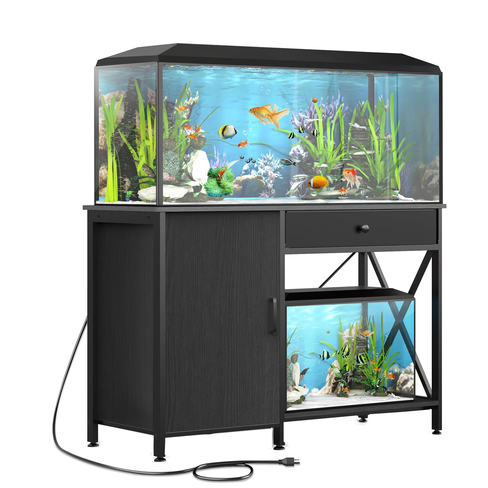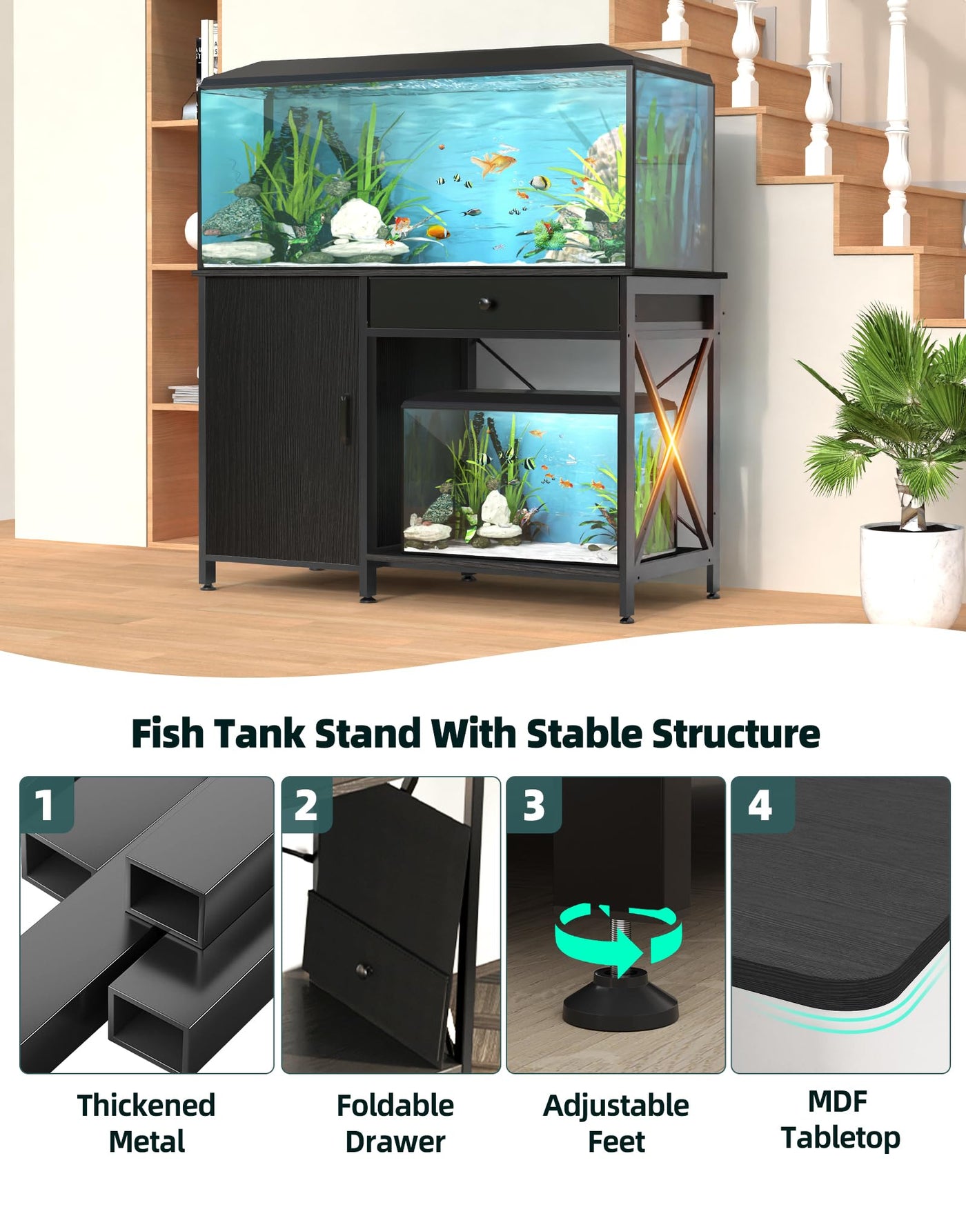 Heavy-duty Fish Tank Stand: Aquarium stand is engineered with a sturdy X-cross metal frame and adjustable foot pads, providing exceptional stability on uneven floors; Fish stand desktop weight capacity is up to 850 pounds, while the bottom shelf can hold up to 150 pounds; With strong weight-bearing capacity, ensure your fish tank is safe and stable | Convenient Storage Cabinet: Aquarium table offers a spacious cabinet and a foldable drawer; Easily stores fish food, filter nets, cleaning tools, etc., keeping supplies tidy and convenient to use; High-quality hardware accessories ensure cabinet door will not fall off, making fish stand more durable | Fit for Double Tank Stand: Large fish tank stand fits most 40-50 gallon tanks (36L x 18W tabletop) and right bottom compartment for 5-10 gallon tanks. Reinforced; Thickened leg design ensures strong support; Powder coating ensures durability and moisture resistance, extending the life of aquarium stand | Safe Built-In Power Outlets: 40 gallon fish tank stand has a built-in power outlet to prevent water contact and ensure safety; Easily connect electronic devices such as lights, heaters and pumps without the hassle of additional extension cords; The 6 slot on the back of the fish tank stands allow for facilitates pipe connections and better cabinet ventilation to reduce moisture | Stylish & Modern Style: With a modern black metal frame and MDF wood grain texture tabletop, making fish tank with stand suitable for any modern, industrial, or rustic decor; Ideal for fish tanks, turtle enclosures, or reptile terrariums in the living room, bedroom, or office | Easy to Assemble with Clear Instructions: Assembling aquarium stand 40 gallon is quick and easy! Package includes a detailed instructions, all necessary accessories, and a helpful video tutorial; You can easily set up your fish tank table without extra tools required; Need help? Our customer service is ready to assist you