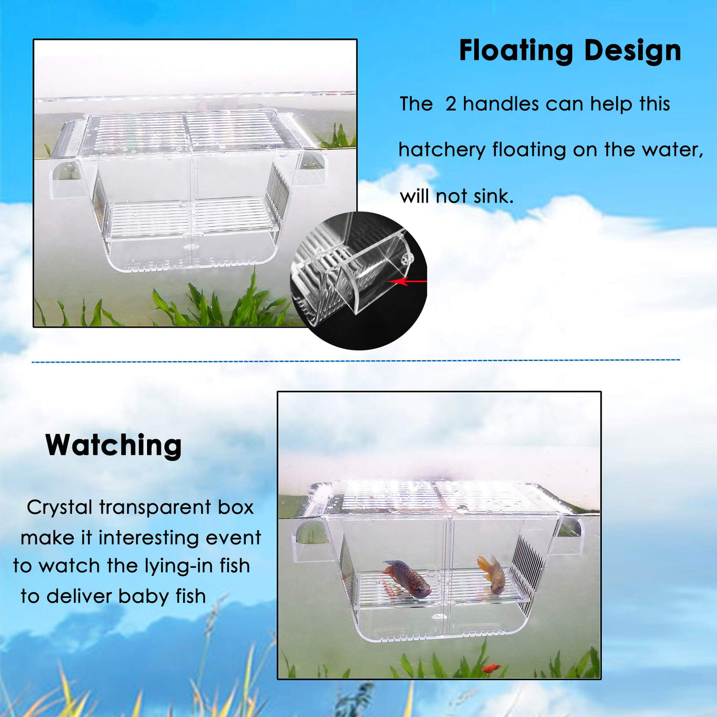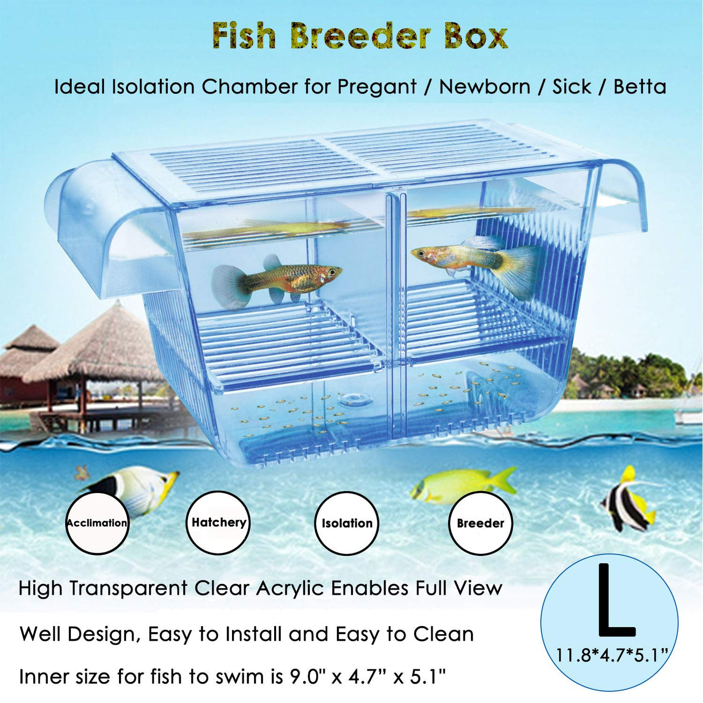 Size: 11.8 X 4.7 X 5.1 ( L x W x H ) Inner Size for fish to swim : 9.0 x 4.7 x 5.1 ( L x W x H ) 100% brand new and high quality. ? Feature: ?. Perfect Isolation and protection for sick, injured or pregnant fish from offensive fish,improve the survival rate in your tank. ?. High transparency crystal hatchery box make it an extremely interesting event to watch the lying-in fish to deliver baby fish. ?. The gap is small, it can allow normal water flow but will keep the small fish from going out. ?. For breeding,fit the removable grating in the box so the newborn fish can be more safe. ?. It comes with isolating board and strong suction cup , firm and space saving design. ?. Suitable for freshwater and marine aquarium. ? Notes: 1.without grating: It can fit for raising small fry and for isolating a sick or aggressive fish. 2.with grating and divider, there are different rooms for fishes in different situation. ? Tips: Allow the breeding box to sink slowly in the aquarium,and the breeding box will fill up with aquarium water and stay floating. Newborn fishes have the instinct to hide in tight crevices immediately after they are born. In this case, you had better put something inside for them to hide, such as water plants or moss balls in case that they will get stuck between the net and the plastic frame. ? Shape and size: Material: Acrylic Color: Transparent clear Weight :0.26kg/0.57lb Measurement:(L*W*H):310 x 120 x 130mm / 11.8 x 4.7 x 5.1 inch ?Packing list: 1Pc x Fish Breeding Box ( M ) Capetsma offers: ?? Superior products ?? Amazon 30 day full money back guarantee ?? Customer support 24 / 7 ??If you have any problem, please contact us .