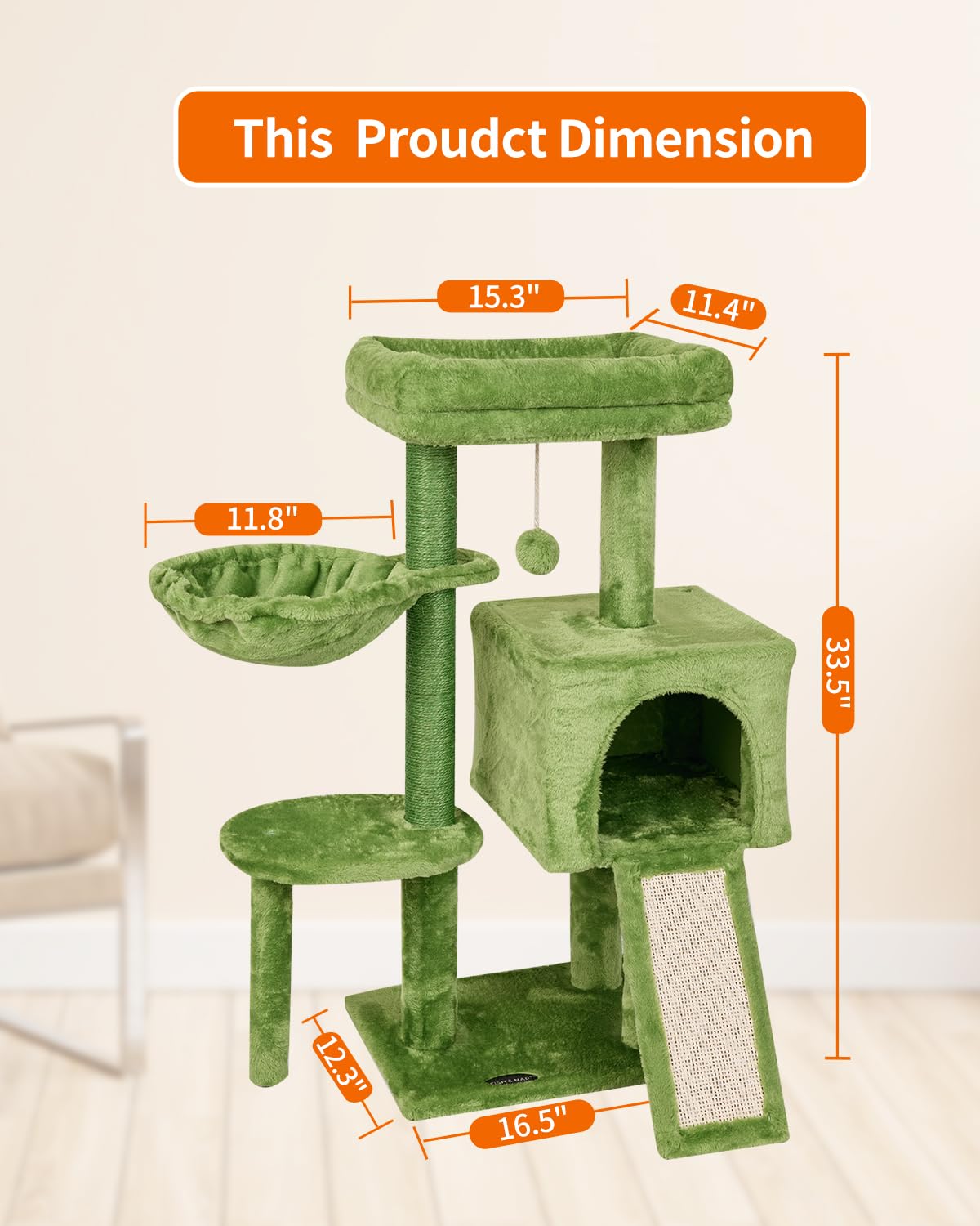 Q: What are the dimensions of the FISH&NAP Cute Cat Tree?A: The overall dimensions of the FISH&NAP Cute Cat Tree are 30 inches in length, 13 inches in width, and 35 inches in height (76X33X89cm).