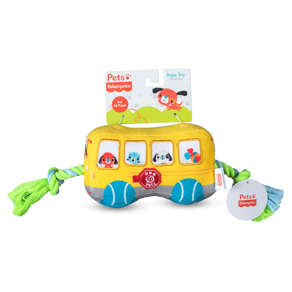 Weve reimagined the classic Fisher-Price preschoolers school bus toy to bring the same nostalgia and fun to your fur-babies playtime! The Fisher-Price Pets School Bus Rope Toy has been designed with playful pups in mind. With an oh-so-tuggable rope and a squeaky inside, your dog will enjoy round after round of playtime with this cute toy! After all, we recognize that play, interaction, and comfort are fundamental keystones in the growth and development of a healthy, happy puppy! Fisher-Price Pets serves up playful practicality with a heavy dose of nostalgia in a collection of pet development products that get you right in the feels. Our toys are fueled by the boundless energy of a little pup in motion, just begging for you to come play.